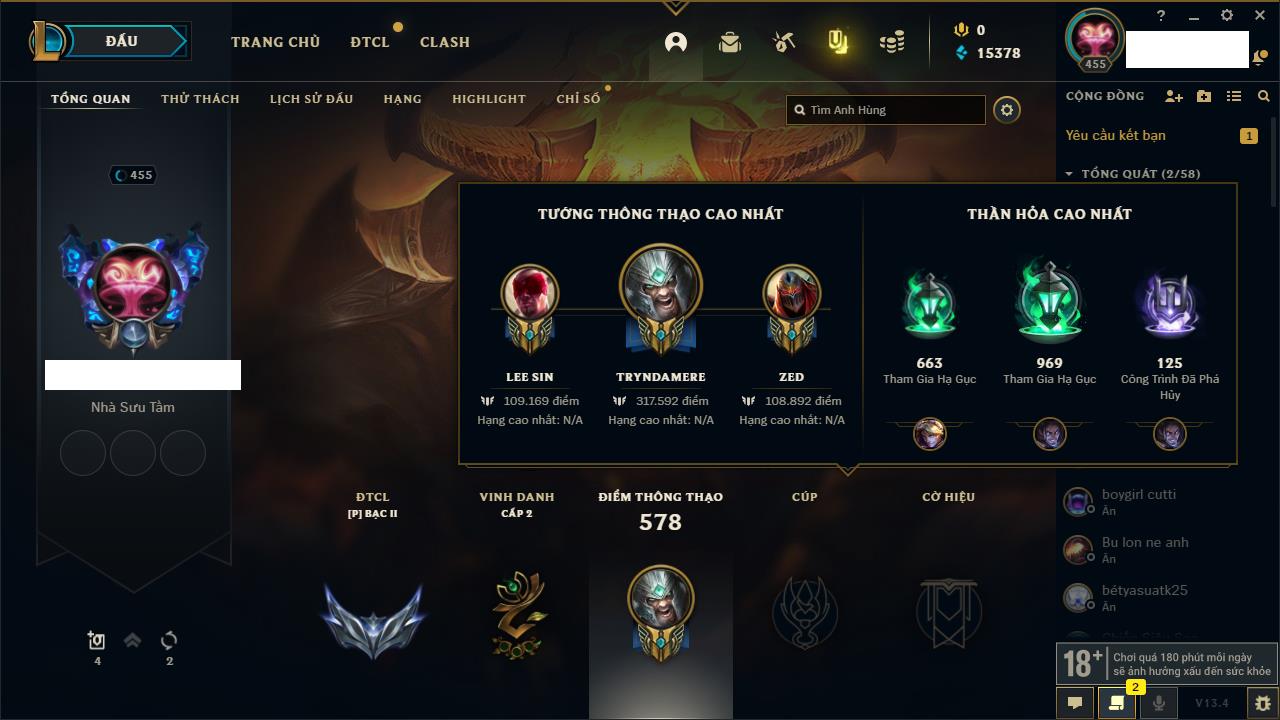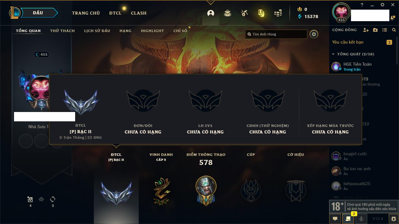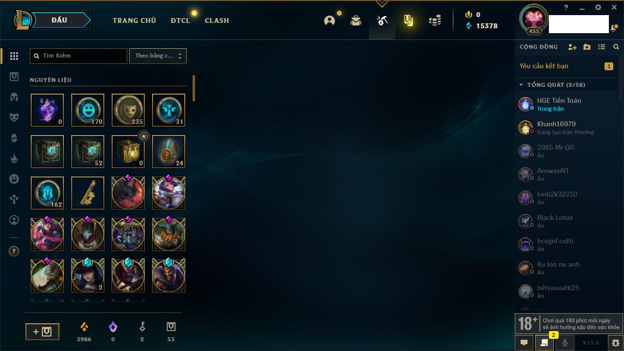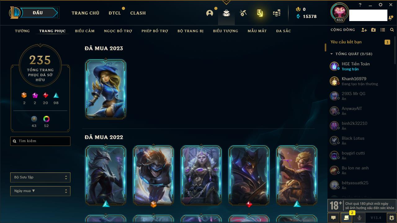 Rank Đơn: Vàng IKhung: Bạch kimTướng: 170 - Còn 212450 THXTrang Phục: 214Rank ĐTCL: Bạch Kim IVLinh Thú: 221