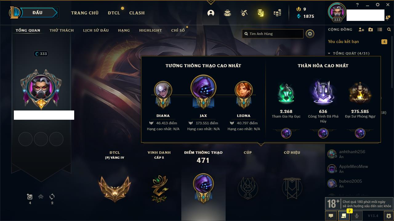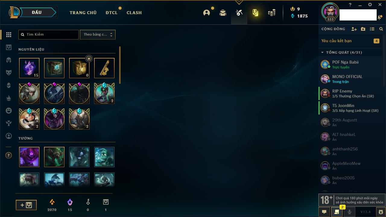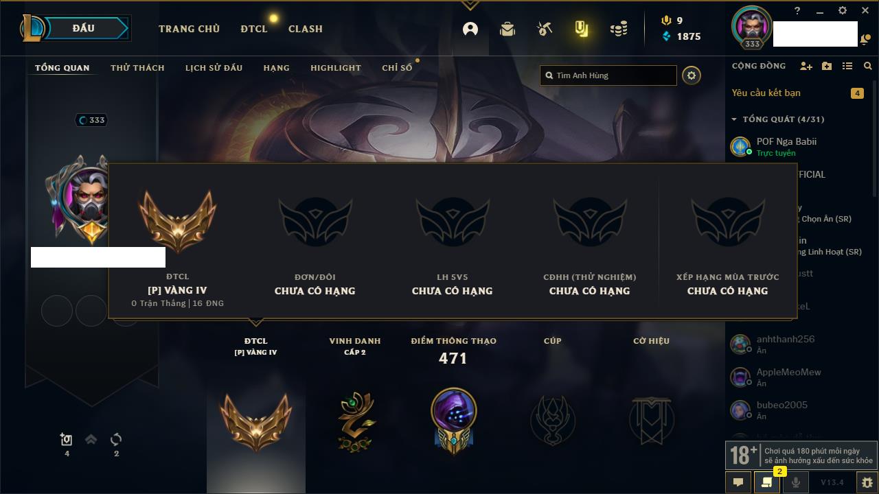 Rank Đơn: Vàng IKhung: BạcTướng: 171 - Còn 60584 THXTrang Phục: 286Rank ĐTCL: Vàng IIILinh Thú: 117