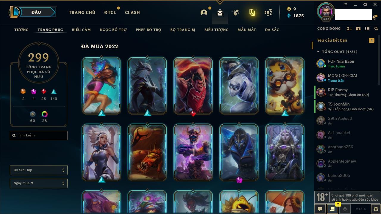 Rank Đơn: Vàng IIIKhung: VàngTướng: 171 - Còn 88128 THXTrang Phục: 329Rank ĐTCL: Chưa RankLinh Thú: 41