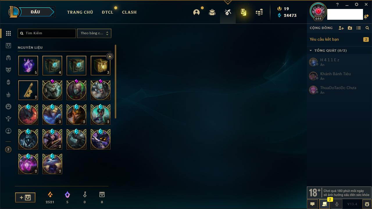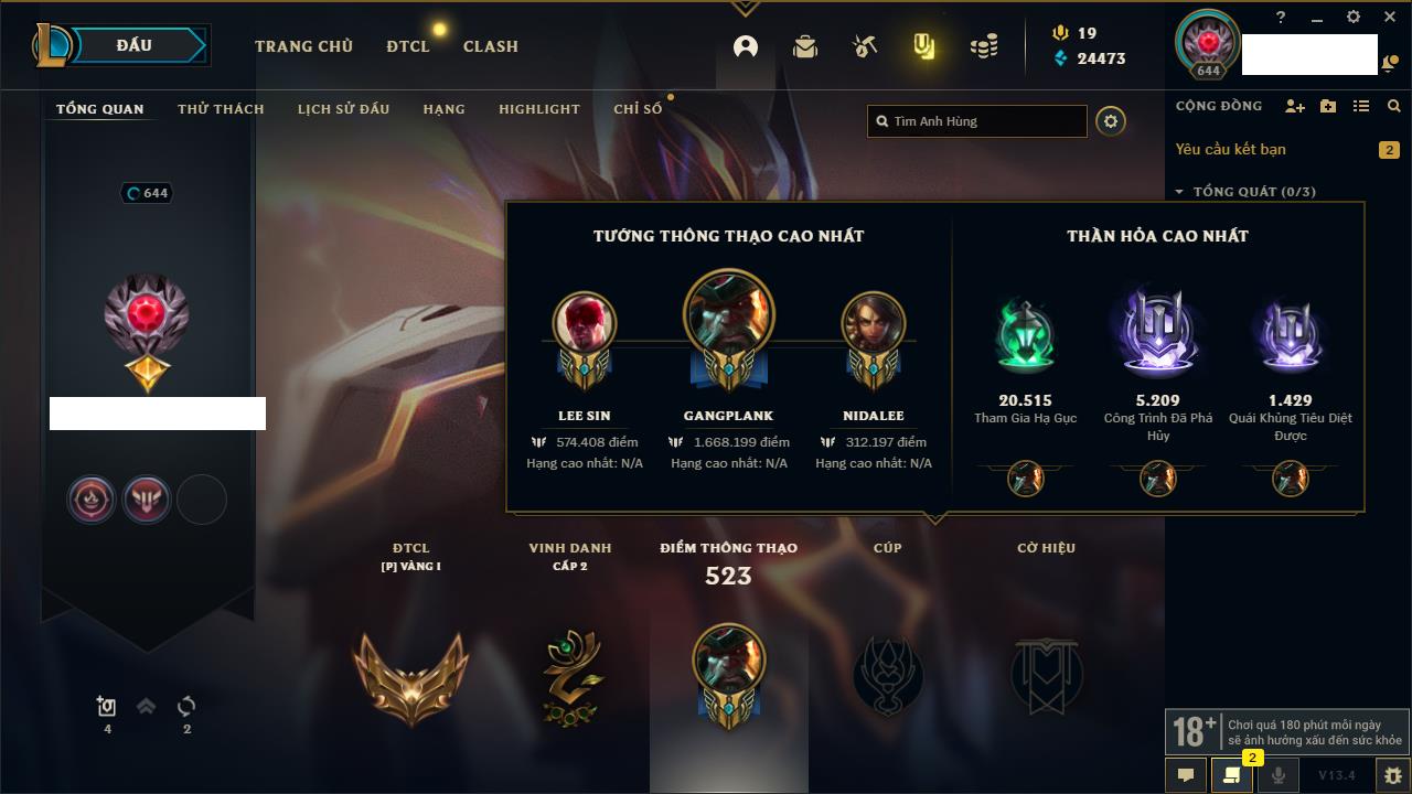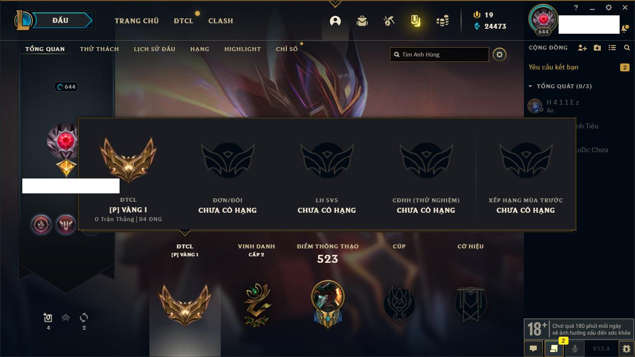 Rank Đơn: Vàng IKhung: BạcTướng: 171 - Còn 60584 THXTrang Phục: 286Rank ĐTCL: Vàng IIILinh Thú: 117