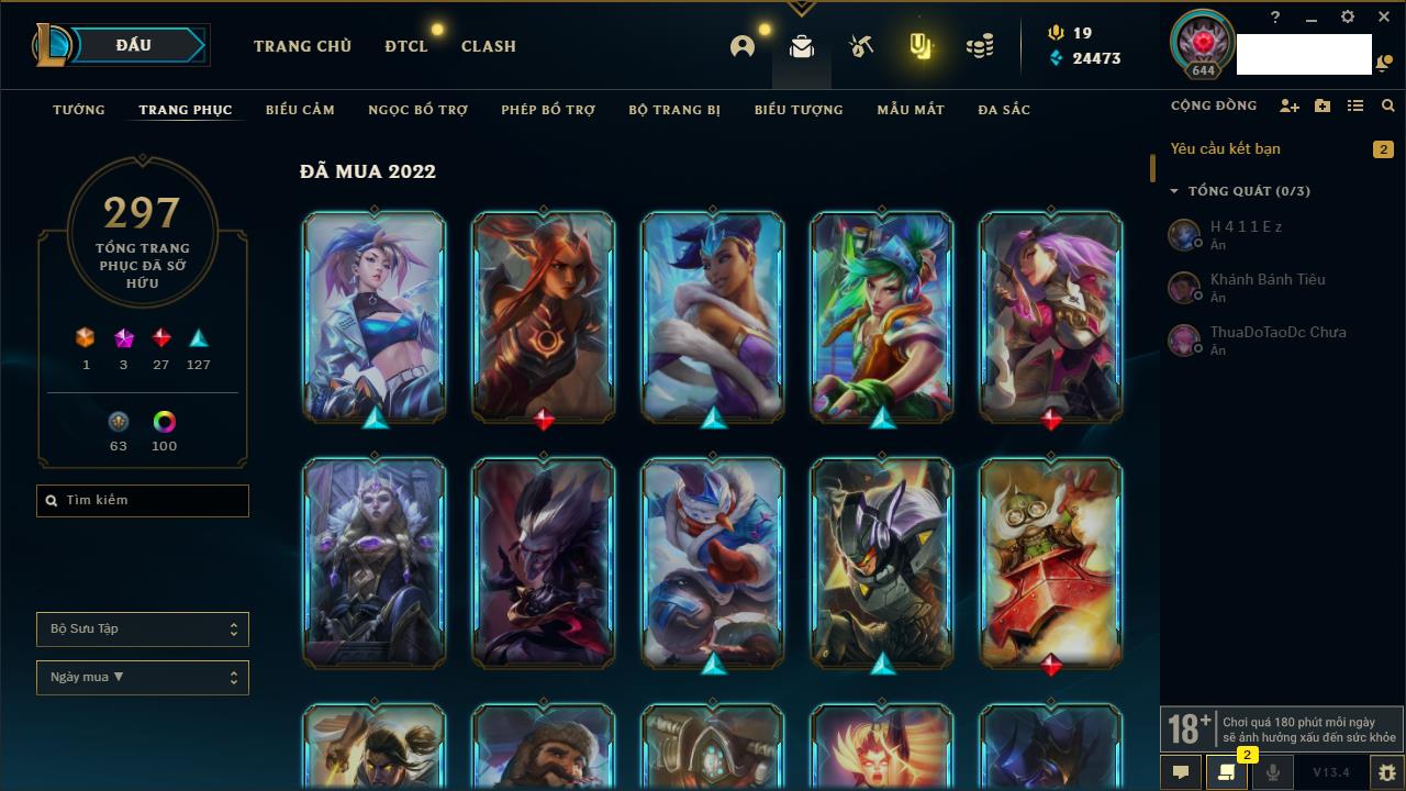 Rank Đơn: Vàng IIIKhung: VàngTướng: 171 - Còn 88128 THXTrang Phục: 329Rank ĐTCL: Chưa RankLinh Thú: 41