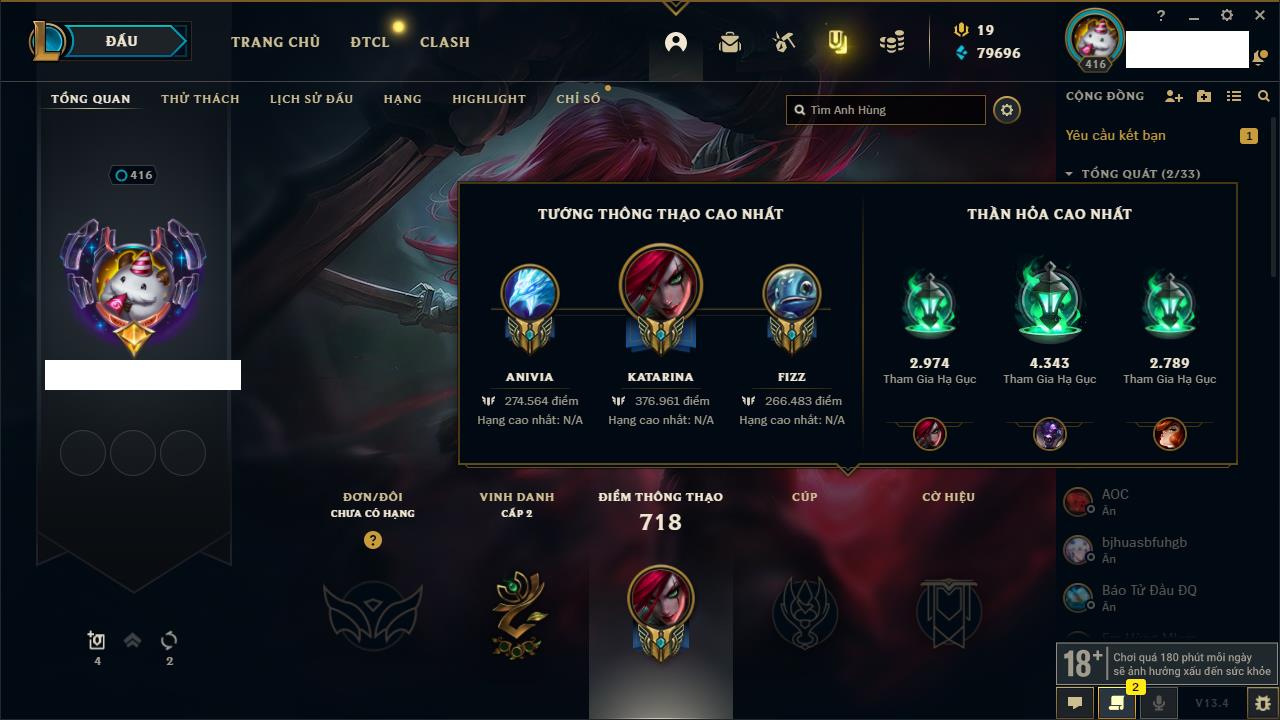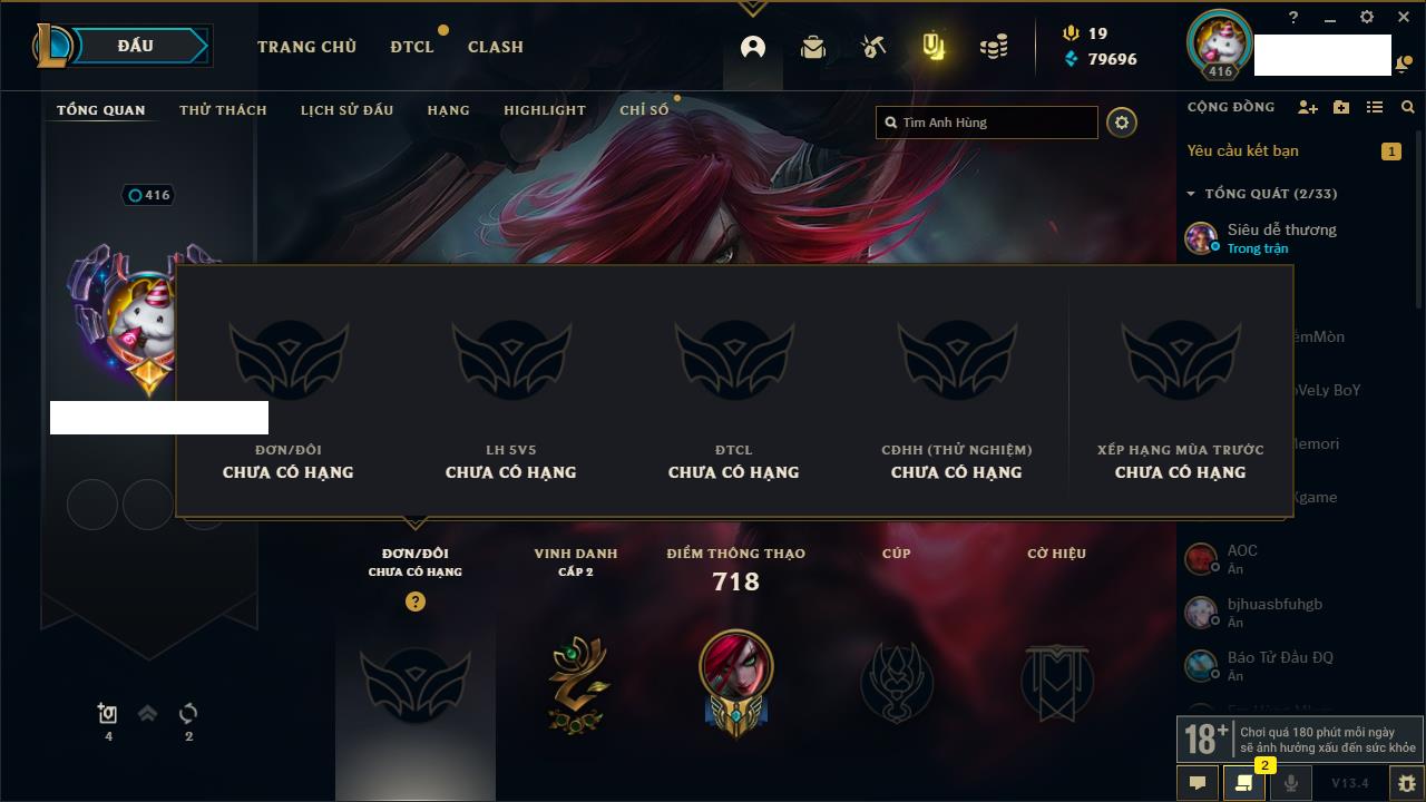 Rank Đơn: Vàng IKhung: BạcTướng: 171 - Còn 60584 THXTrang Phục: 286Rank ĐTCL: Vàng IIILinh Thú: 117