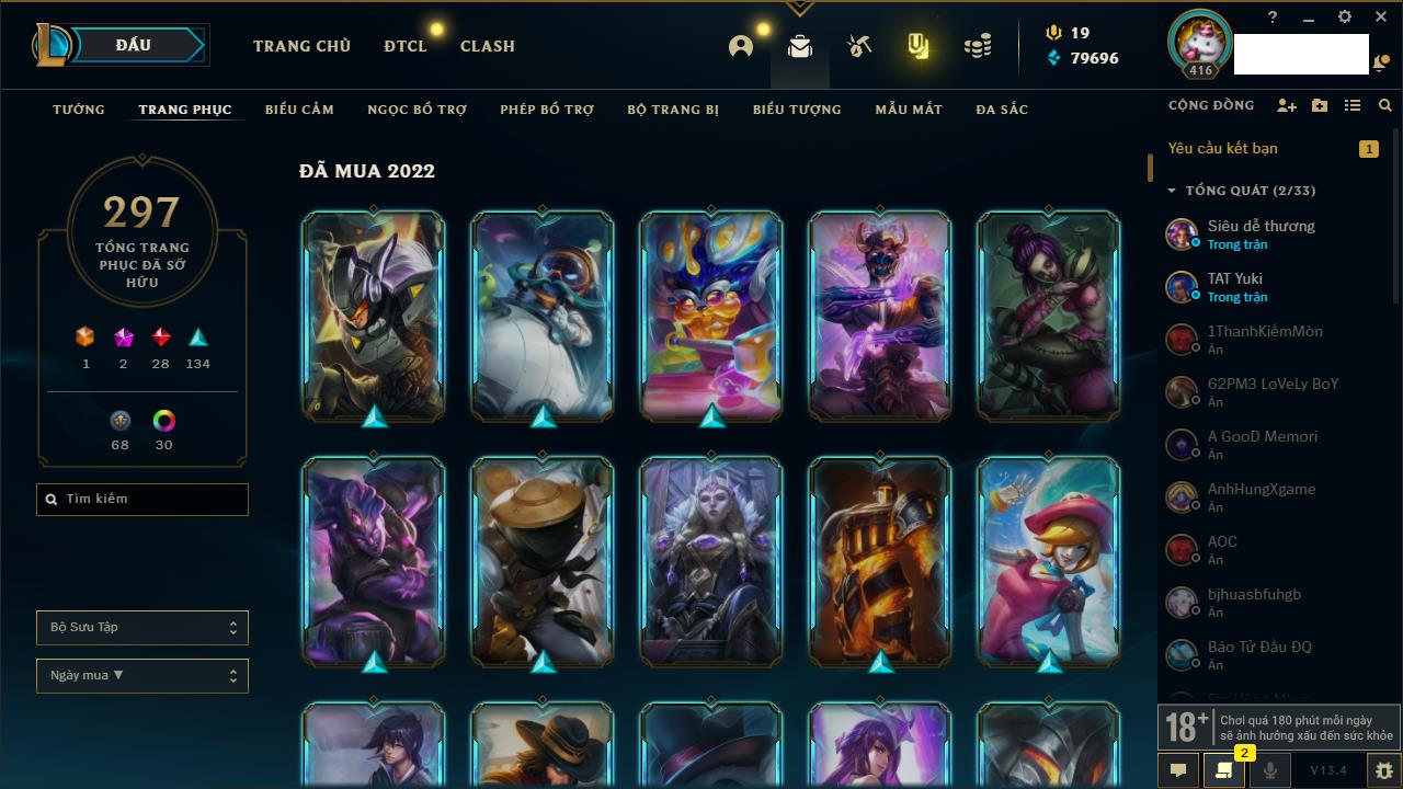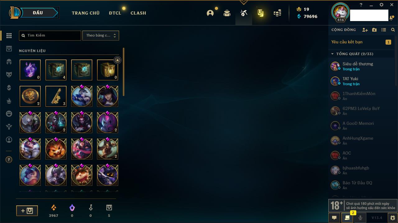 Rank Đơn: Vàng IIIKhung: VàngTướng: 171 - Còn 88128 THXTrang Phục: 329Rank ĐTCL: Chưa RankLinh Thú: 41