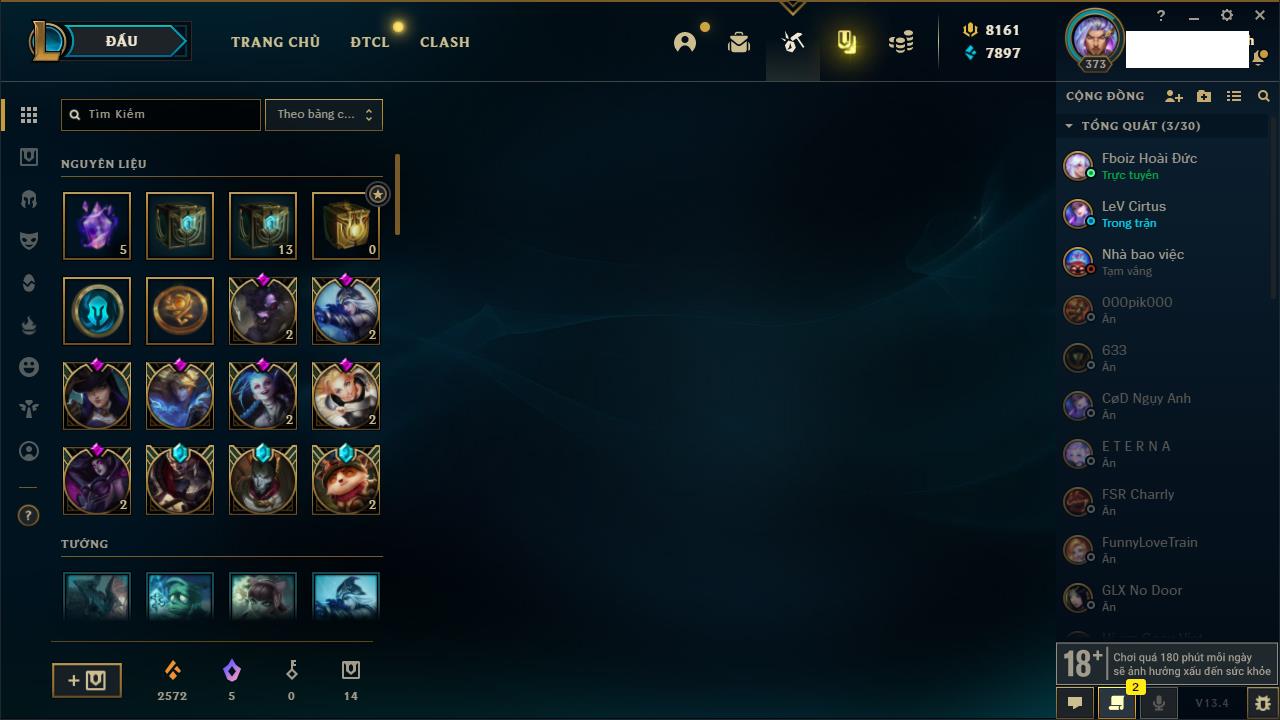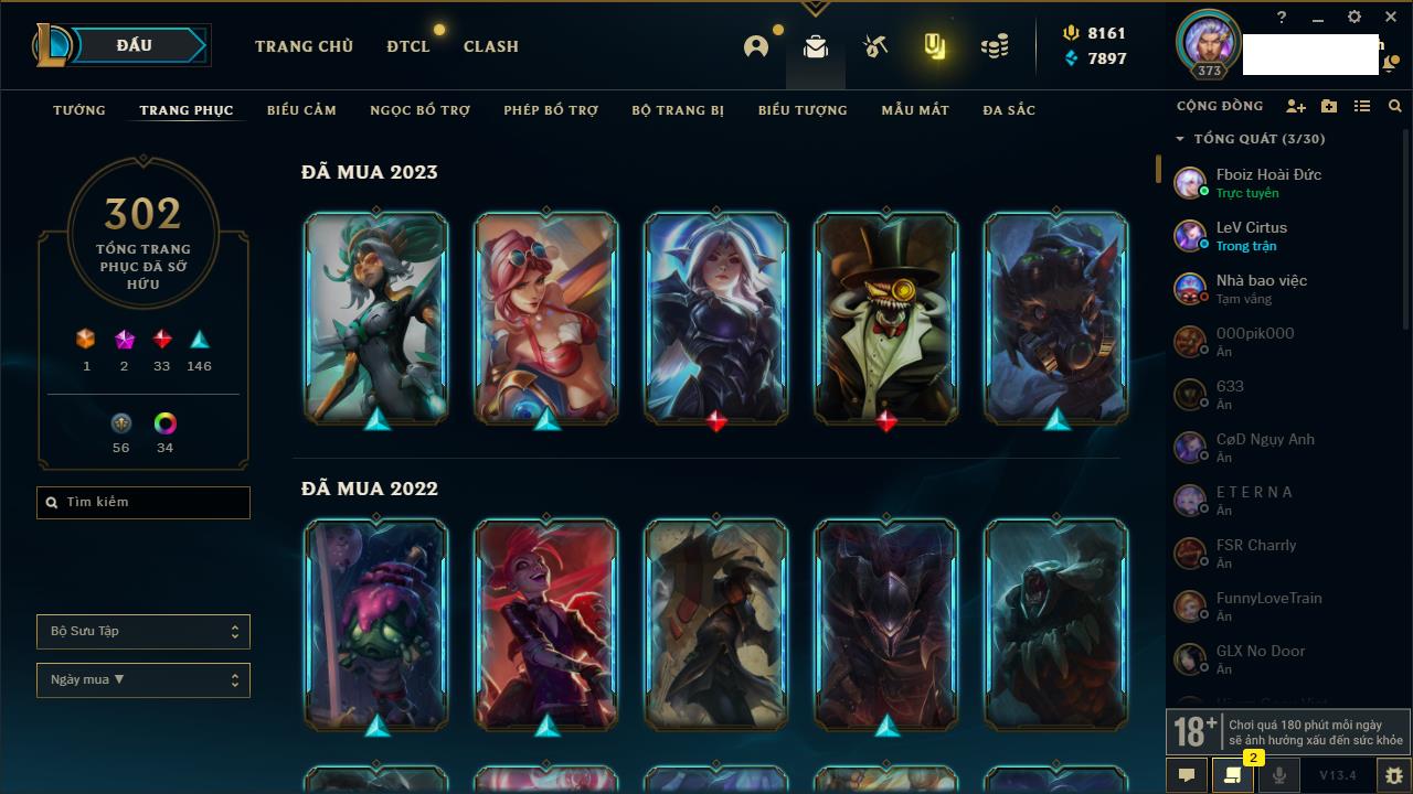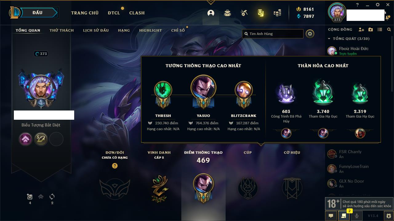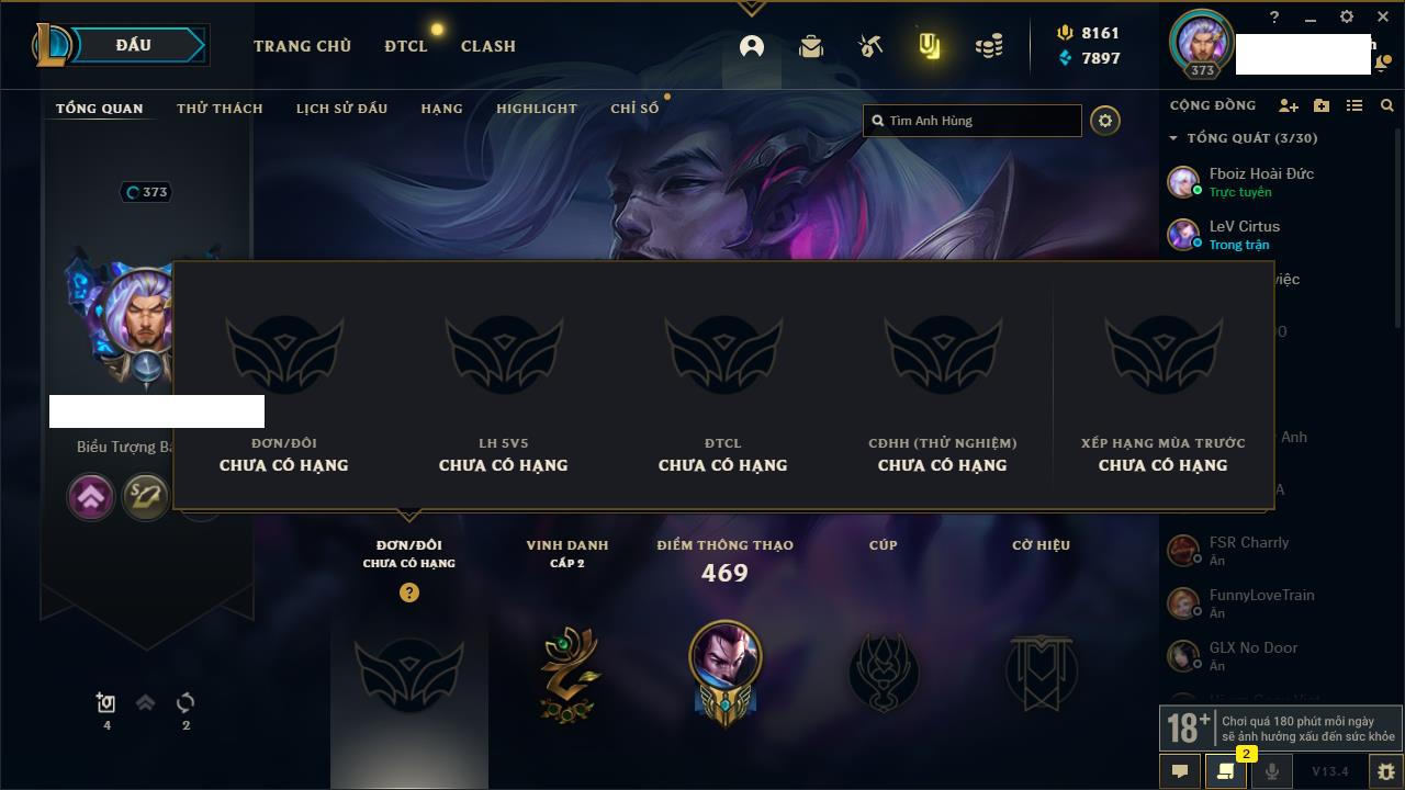 Rank Đơn: Bạc IIKhung: Bạch kimTướng: 169 - Còn 81813 THXTrang Phục: 301Rank ĐTCL: Chưa RankLinh Thú: 140