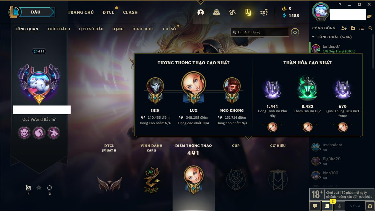 Rank Đơn: Bạch Kim IVKhung: Bạch kimTướng: 171 - Còn 54021 THXTrang Phục: 327Rank ĐTCL: Chưa RankLinh Thú: 115