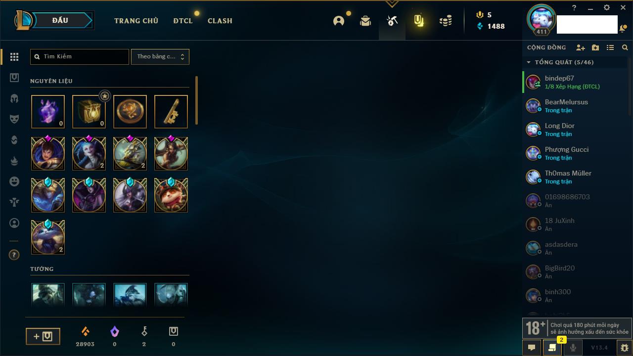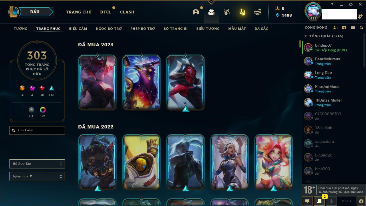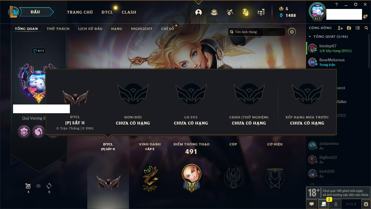 Rank Đơn: Vàng IKhung: BạcTướng: 171 - Còn 60584 THXTrang Phục: 286Rank ĐTCL: Vàng IIILinh Thú: 117