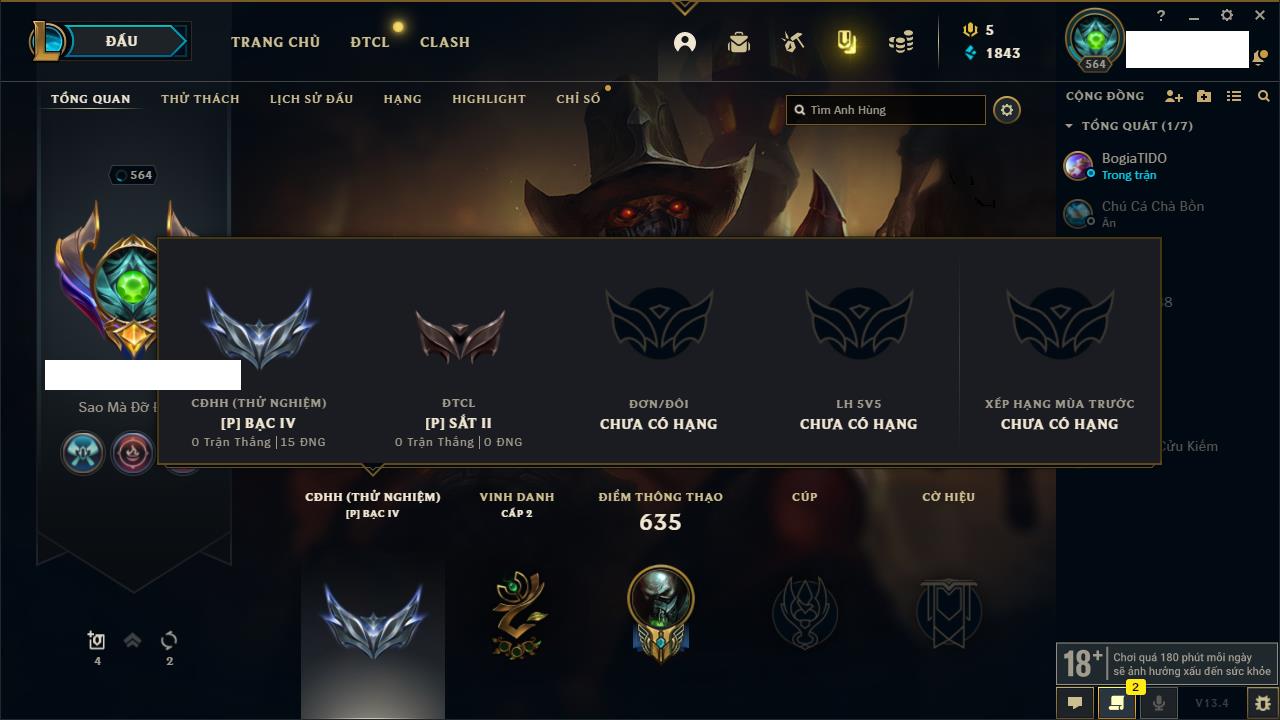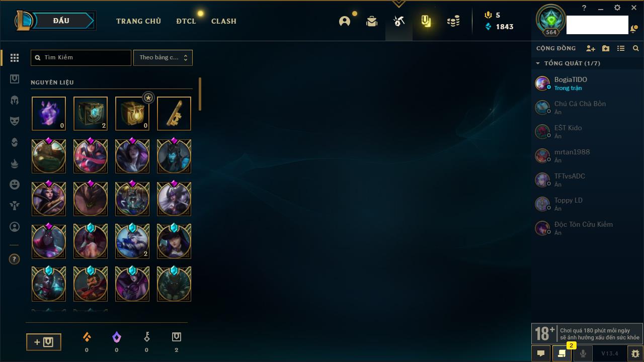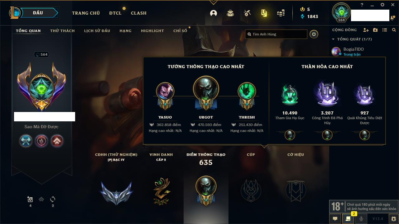 Rank Đơn: Vàng IKhung: BạcTướng: 171 - Còn 60584 THXTrang Phục: 286Rank ĐTCL: Vàng IIILinh Thú: 117