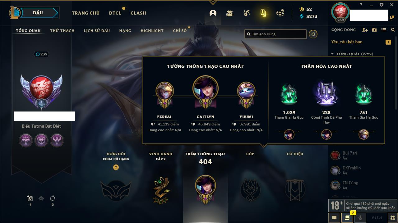 Rank Đơn: Vàng IVKhung: VàngTướng: 171 - Còn 135001 THXTrang Phục: 195Rank ĐTCL: Bạch Kim IVLinh Thú: 147
