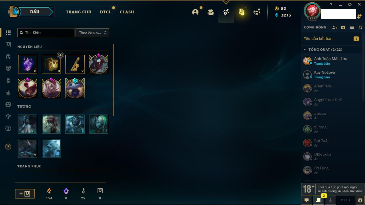 Rank Đơn: Chưa RankKhung: Chưa có khungTướng: 170 - Còn 14503 THXTrang Phục: 180Rank ĐTCL: Chưa RankLinh Thú: 131