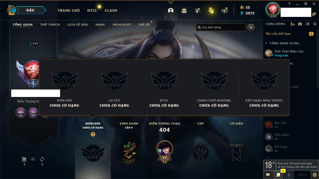 Rank Đơn: Bạc IIIKhung: BạcTướng: 170 - Còn 76760 THXTrang Phục: 235Rank ĐTCL: Chưa RankLinh Thú: 183