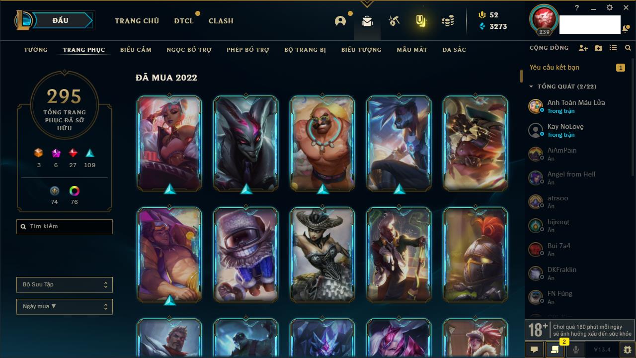Rank Đơn: Vàng IVKhung: VàngTướng: 170 - Còn 207451 THXTrang Phục: 275Rank ĐTCL: Chưa RankLinh Thú: 186