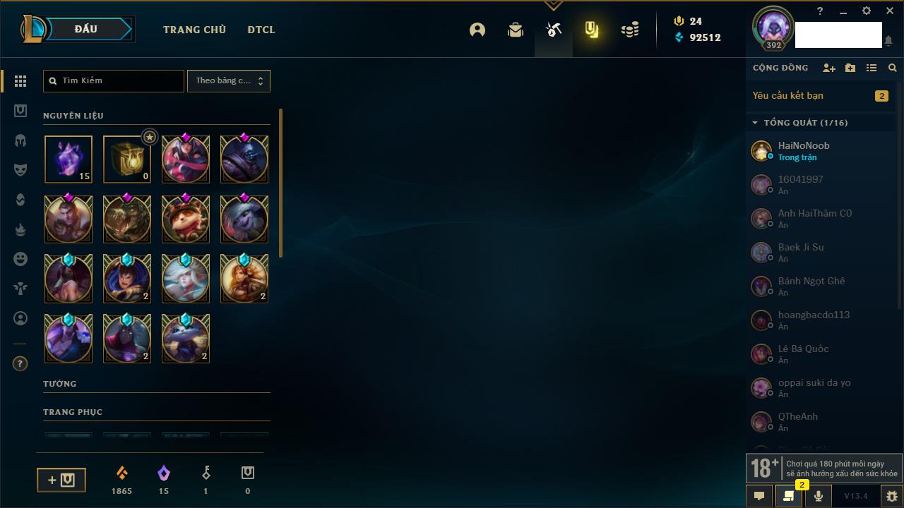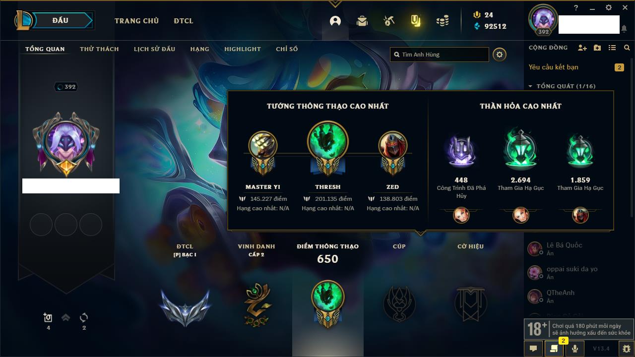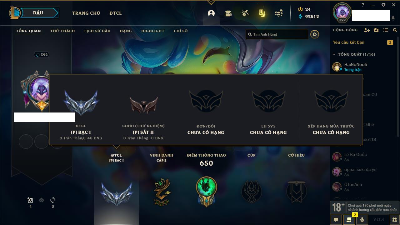 Rank Đơn: Vàng IKhung: BạcTướng: 171 - Còn 60584 THXTrang Phục: 286Rank ĐTCL: Vàng IIILinh Thú: 117