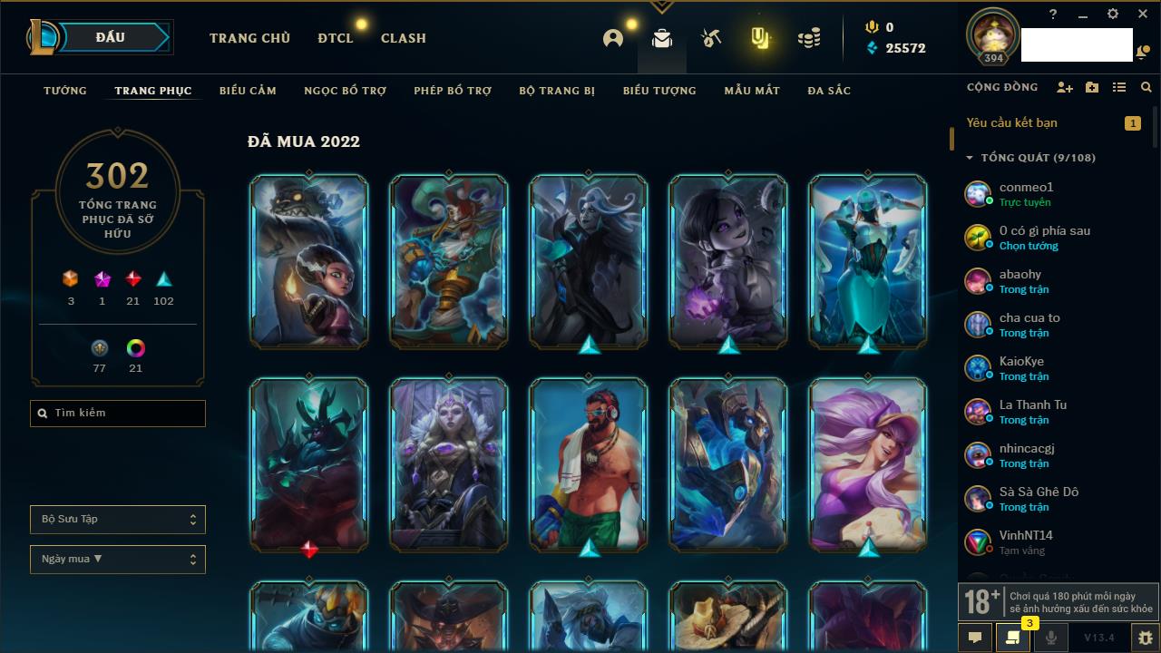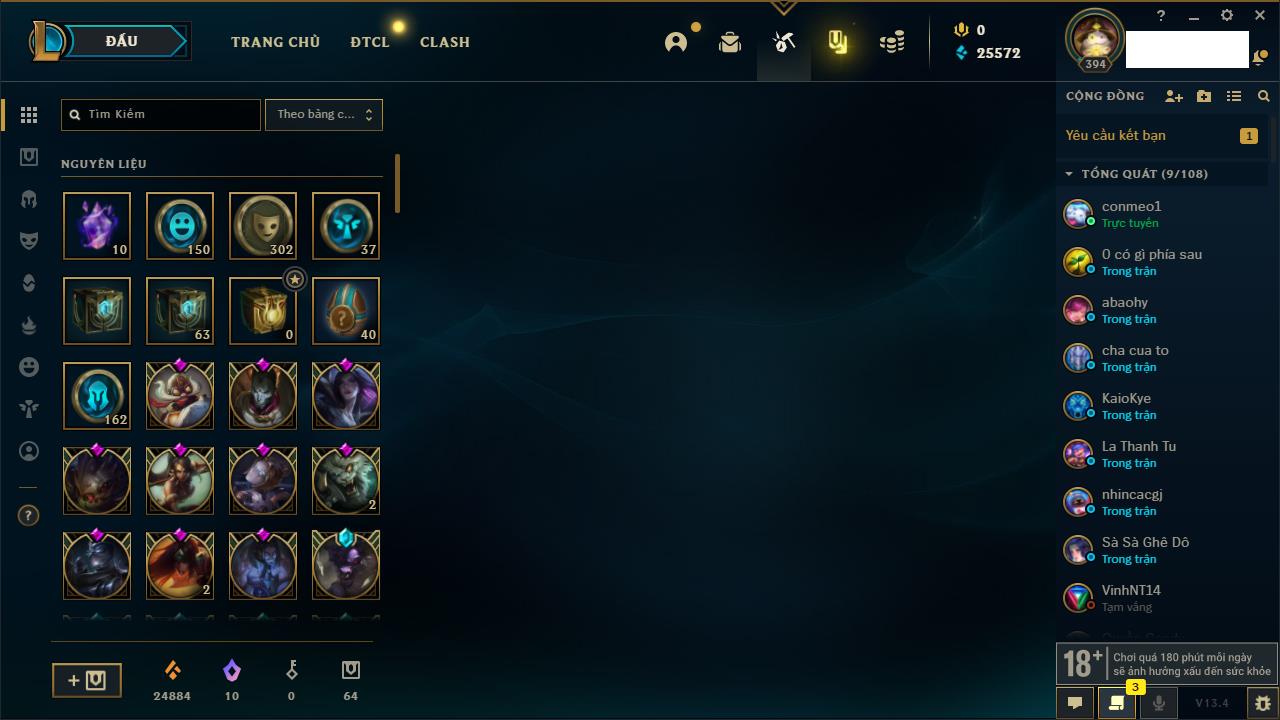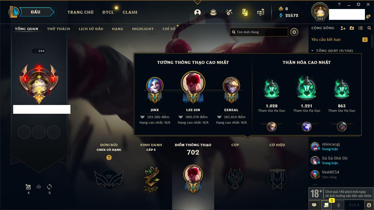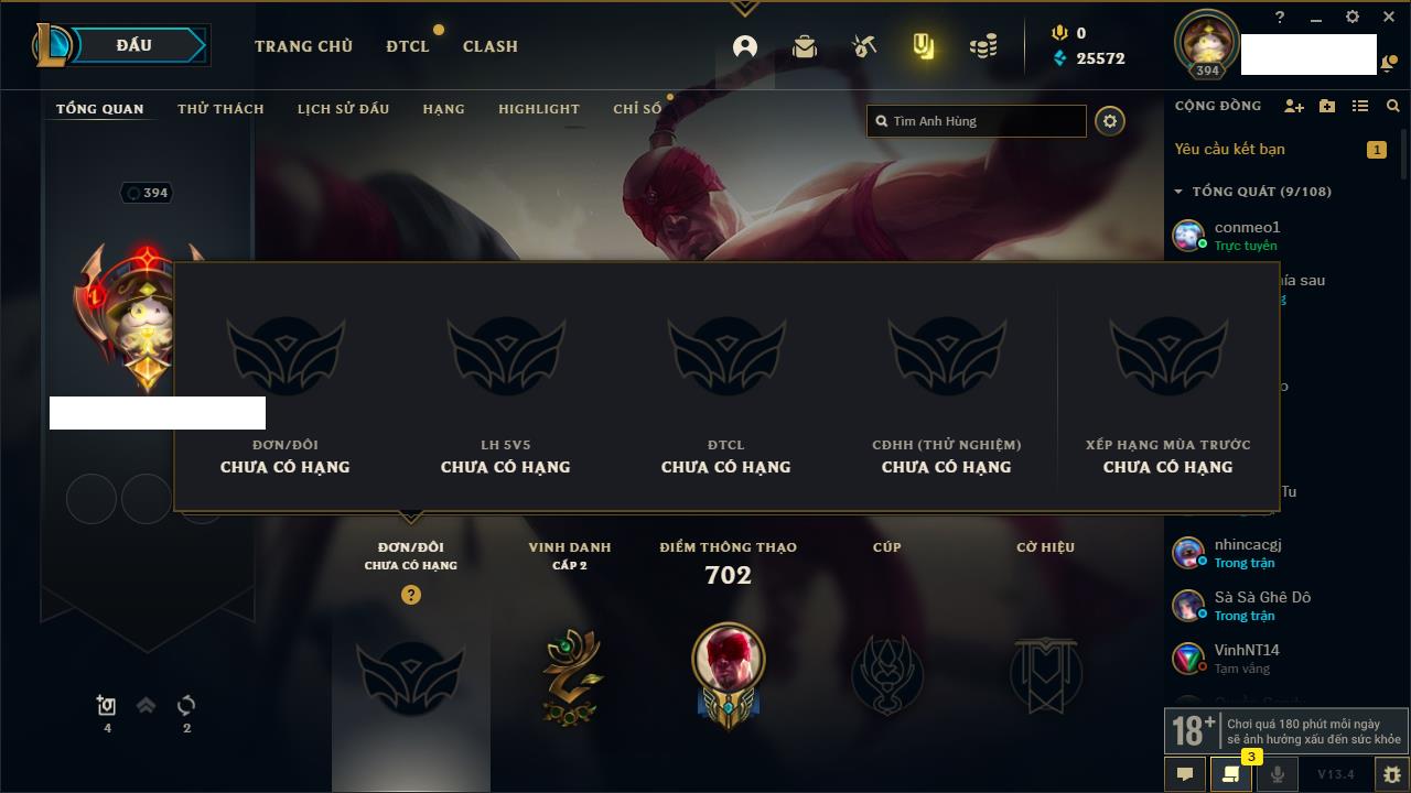 Rank Đơn: Bạc IIKhung: Bạch kimTướng: 169 - Còn 81813 THXTrang Phục: 301Rank ĐTCL: Chưa RankLinh Thú: 140