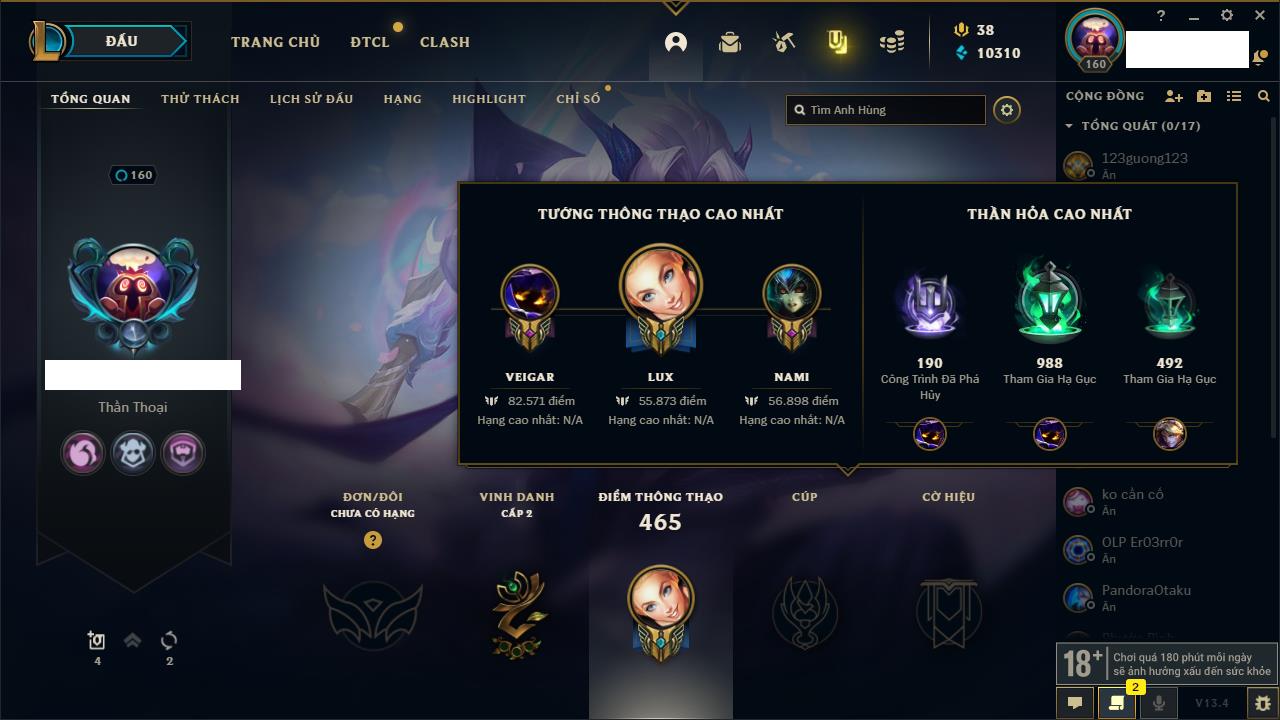 Rank Đơn: Lục Bảo IVKhung: Chưa có khungTướng: 171 - Còn 165973 THXTrang Phục: 160Rank ĐTCL: Chưa RankLinh Thú: 9