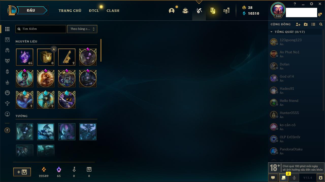 Rank Đơn: Vàng IIKhung: VàngTướng: 171 - Còn 34018 THXTrang Phục: 250Rank ĐTCL: Sắt IILinh Thú: 19