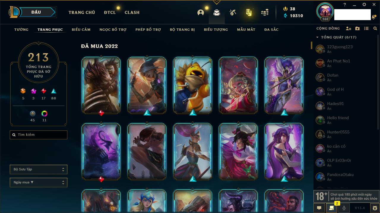 Rank Đơn: Vàng IIIKhung: VàngTướng: 171 - Còn 159339 THXTrang Phục: 218Rank ĐTCL: Lục Bảo IIILinh Thú: 151