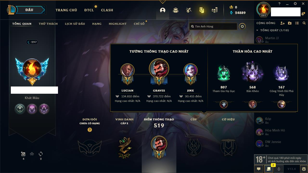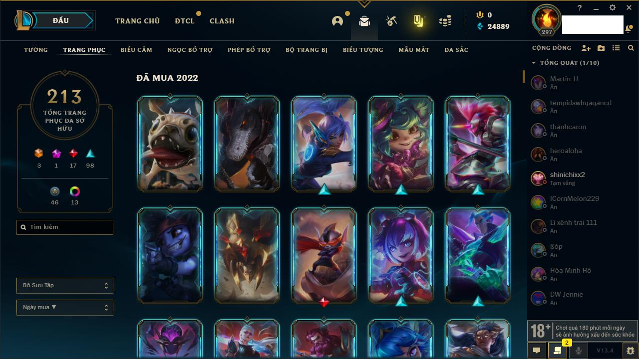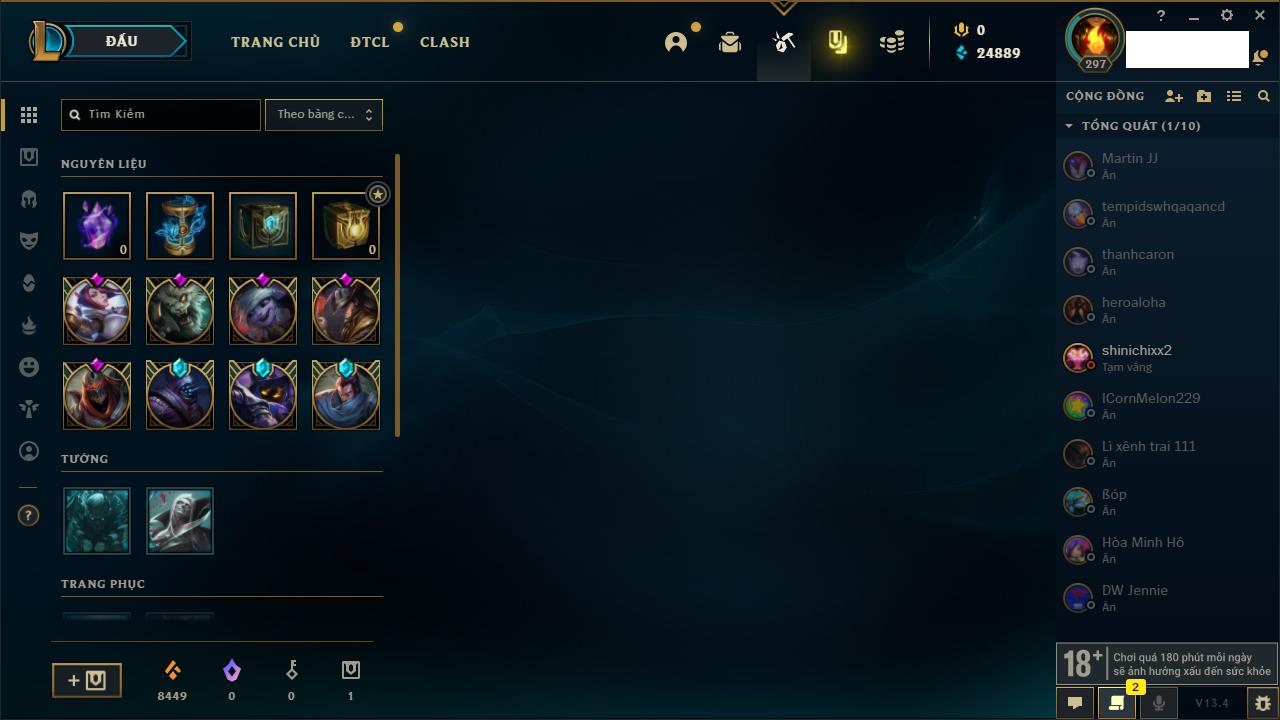 Rank Đơn: Vàng IVKhung: VàngTướng: 171 - Còn 48721 THXTrang Phục: 171Rank ĐTCL: Chưa RankLinh Thú: 27