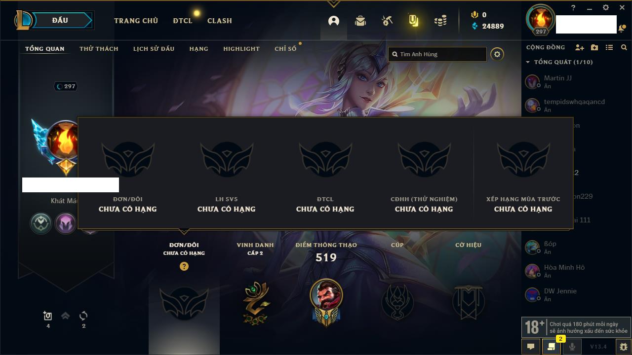 Rank Đơn: Bạc IIKhung: VàngTướng: 171 - Còn 332462 THXTrang Phục: 165Rank ĐTCL: Kim Cương IVLinh Thú: 181