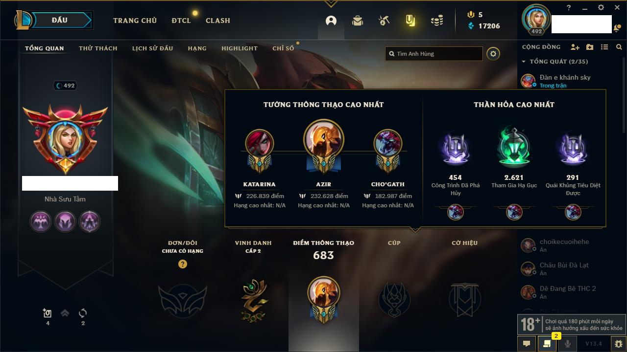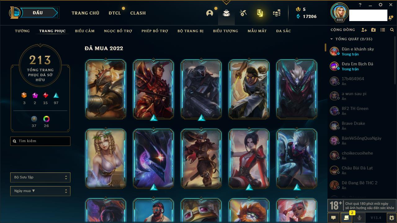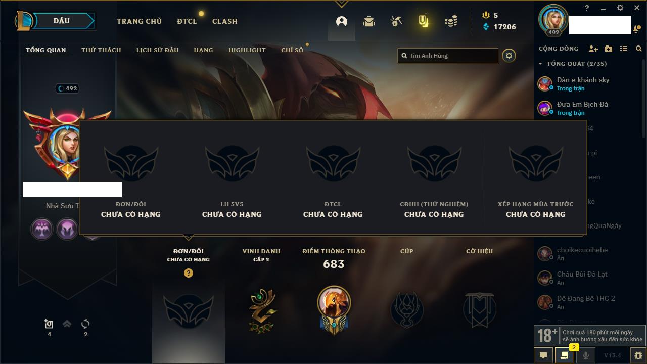 Rank Đơn: Vàng IVKhung: VàngTướng: 171 - Còn 48721 THXTrang Phục: 171Rank ĐTCL: Chưa RankLinh Thú: 27