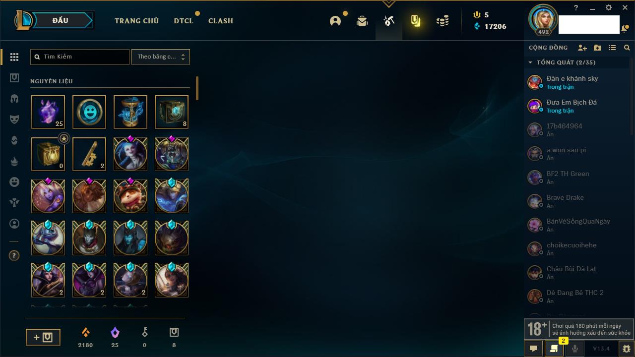 Rank Đơn: Bạc IIKhung: VàngTướng: 171 - Còn 332462 THXTrang Phục: 165Rank ĐTCL: Kim Cương IVLinh Thú: 181