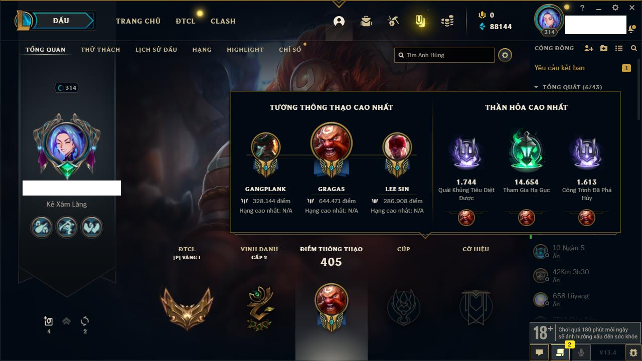Rank Đơn: Vàng IVKhung: VàngTướng: 171 - Còn 48721 THXTrang Phục: 171Rank ĐTCL: Chưa RankLinh Thú: 27