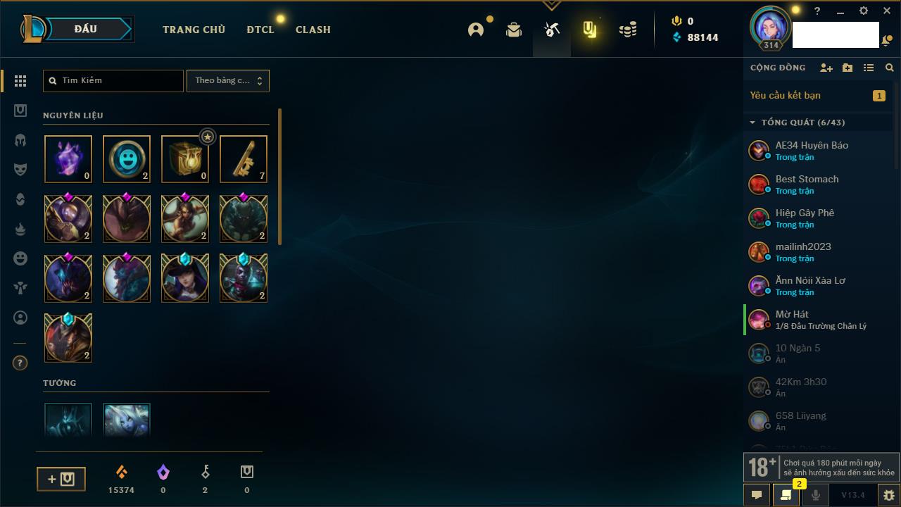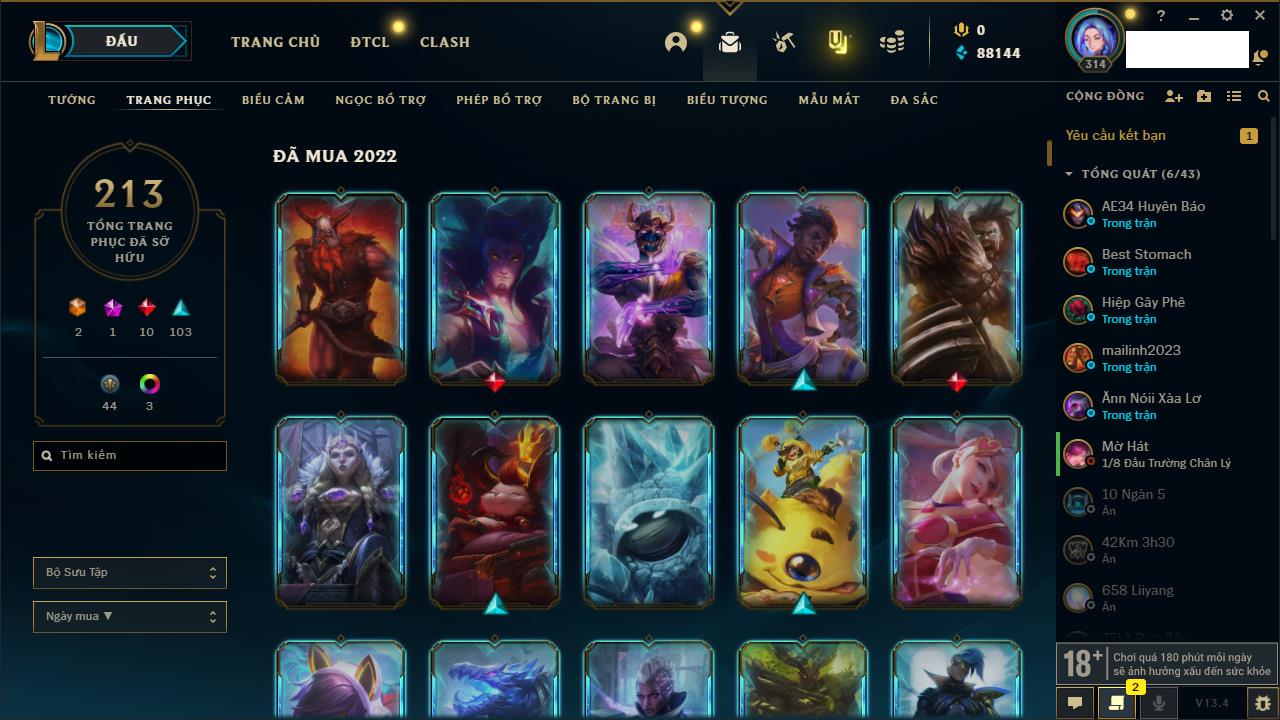 Rank Đơn: Bạc IVKhung: VàngTướng: 172 - Còn 358384 THXTrang Phục: 177Rank ĐTCL: Lục Bảo IILinh Thú: 211