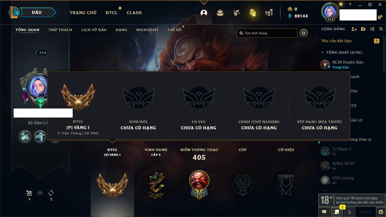 Rank Đơn: Bạc IIKhung: VàngTướng: 171 - Còn 332462 THXTrang Phục: 165Rank ĐTCL: Kim Cương IVLinh Thú: 181