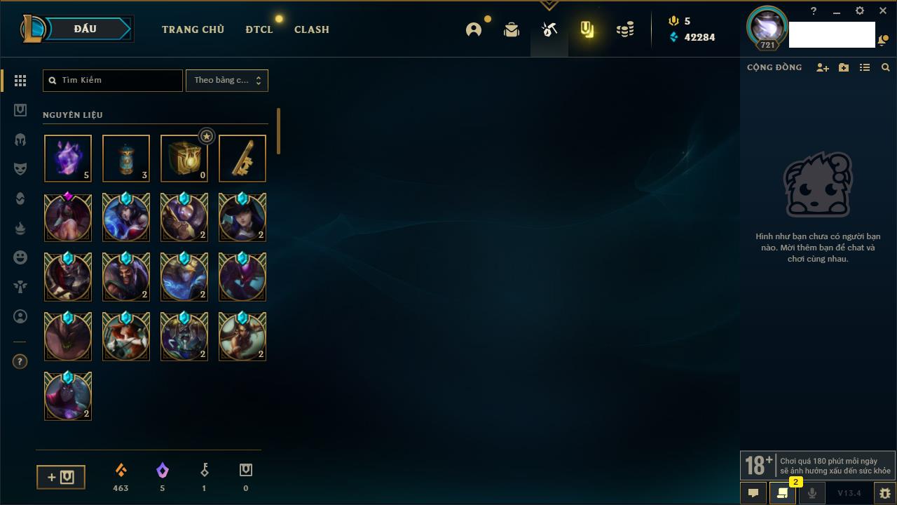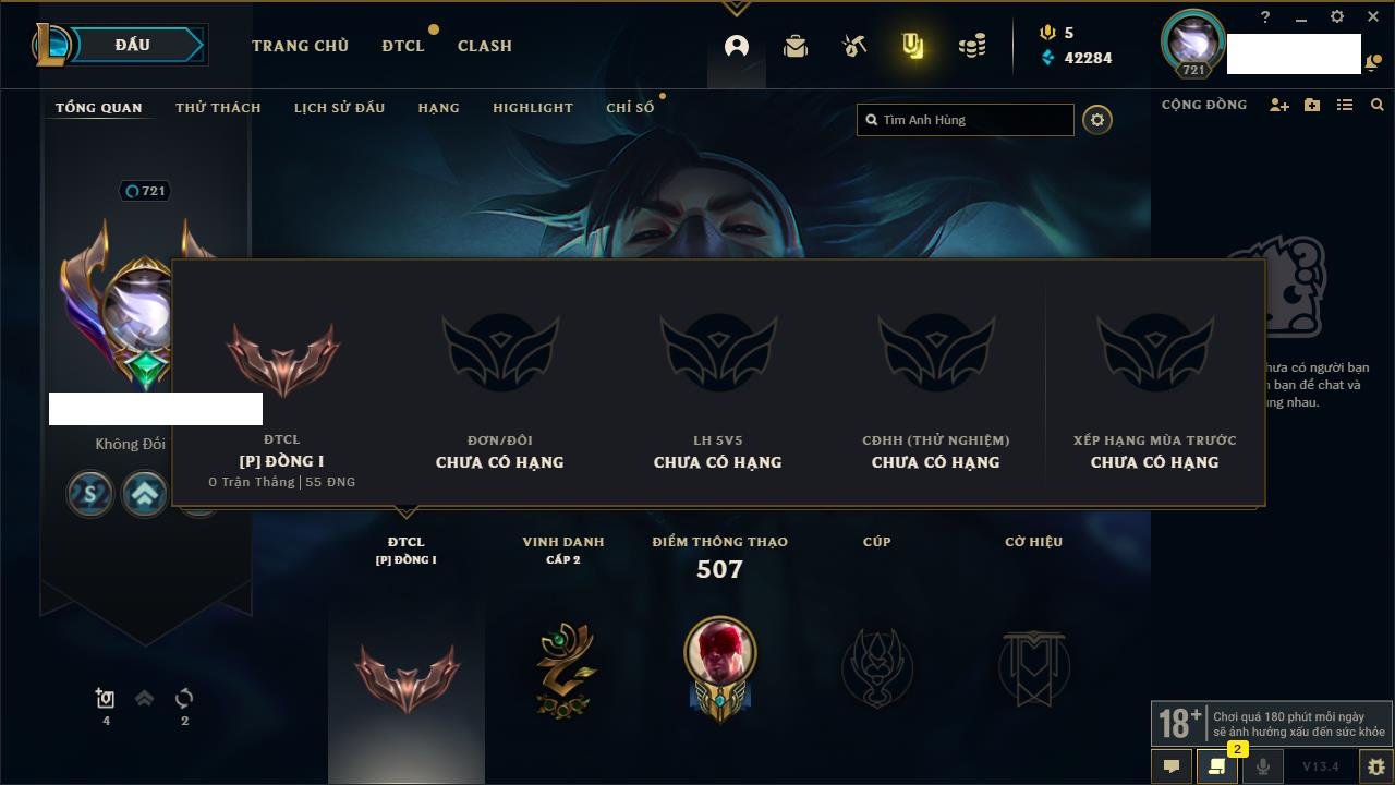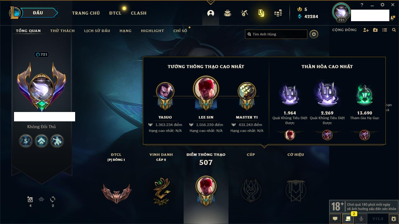 Rank Đơn: Vàng IKhung: BạcTướng: 171 - Còn 60584 THXTrang Phục: 286Rank ĐTCL: Vàng IIILinh Thú: 117