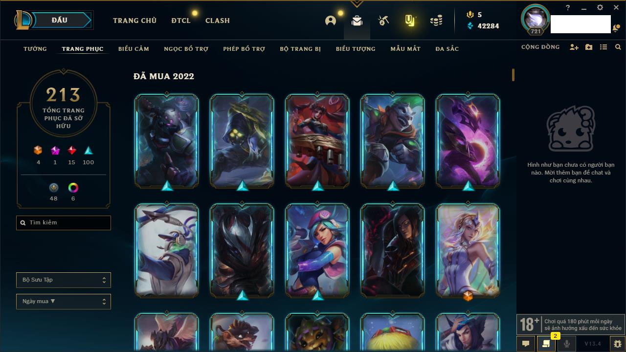 Rank Đơn: Vàng IIIKhung: VàngTướng: 171 - Còn 88128 THXTrang Phục: 329Rank ĐTCL: Chưa RankLinh Thú: 41