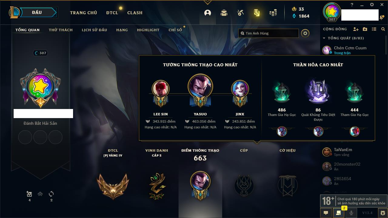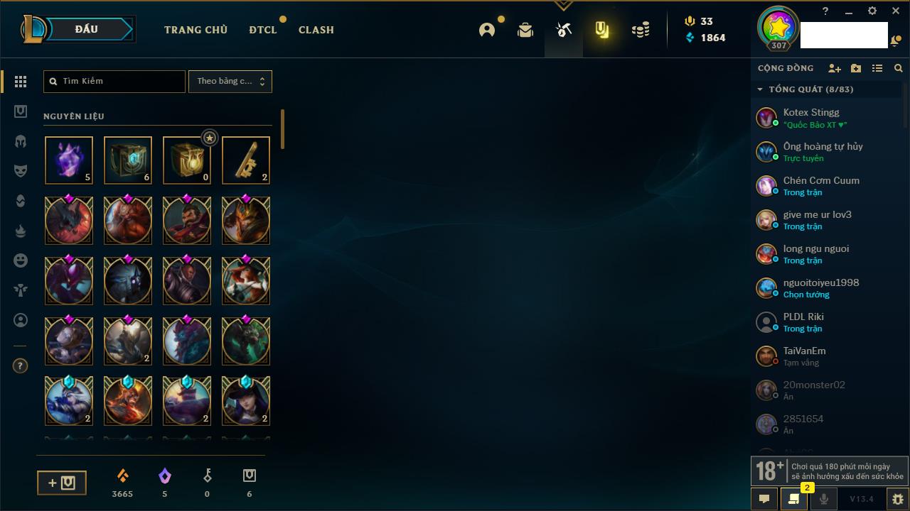 Rank Đơn: Vàng IVKhung: BạcTướng: 166 - Còn 180925 THXTrang Phục: 163Rank ĐTCL: Chưa RankLinh Thú: 67