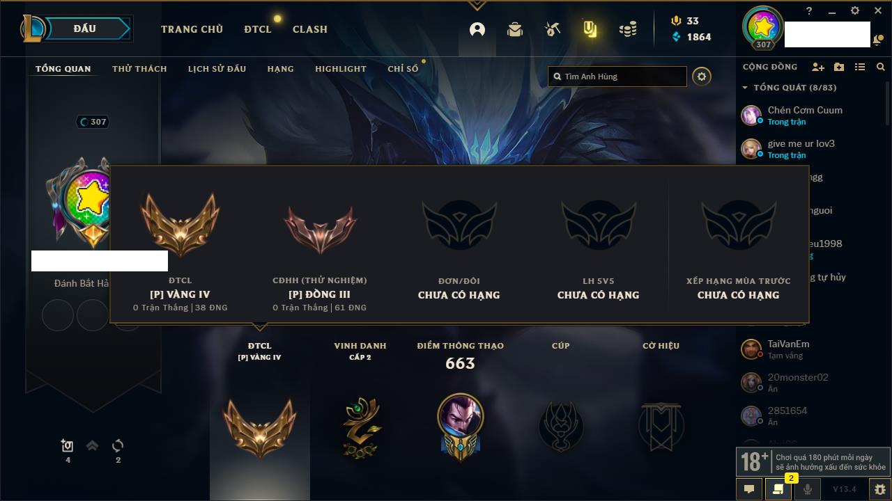 Rank Đơn: Bạc IIKhung: VàngTướng: 171 - Còn 332462 THXTrang Phục: 165Rank ĐTCL: Kim Cương IVLinh Thú: 181