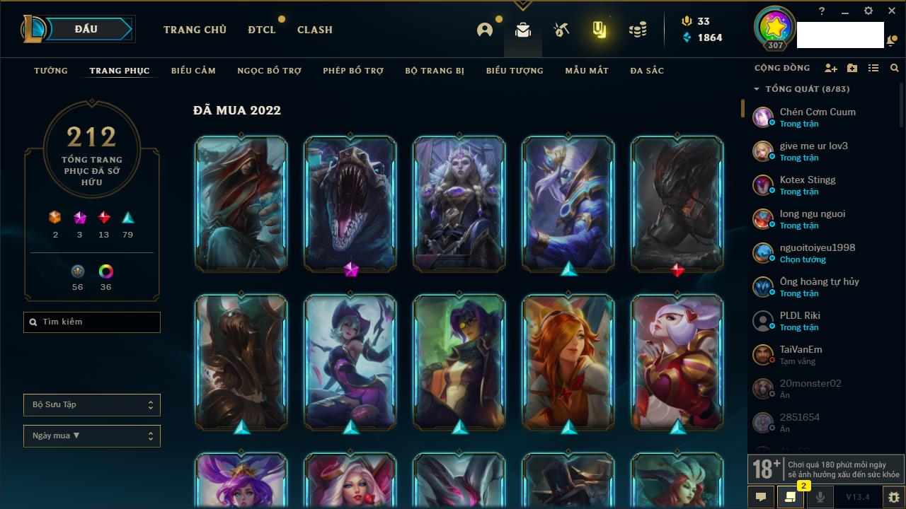 Rank Đơn: Vàng IVKhung: VàngTướng: 171 - Còn 48721 THXTrang Phục: 171Rank ĐTCL: Chưa RankLinh Thú: 27
