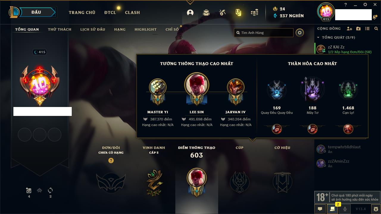 Rank Đơn: Bạch Kim IIKhung: VàngTướng: 171 - Còn 140736 THXTrang Phục: 182Rank ĐTCL: Chưa RankLinh Thú: 14