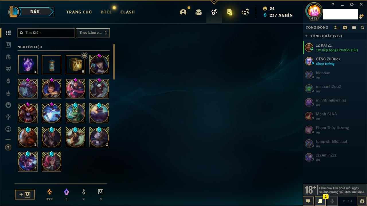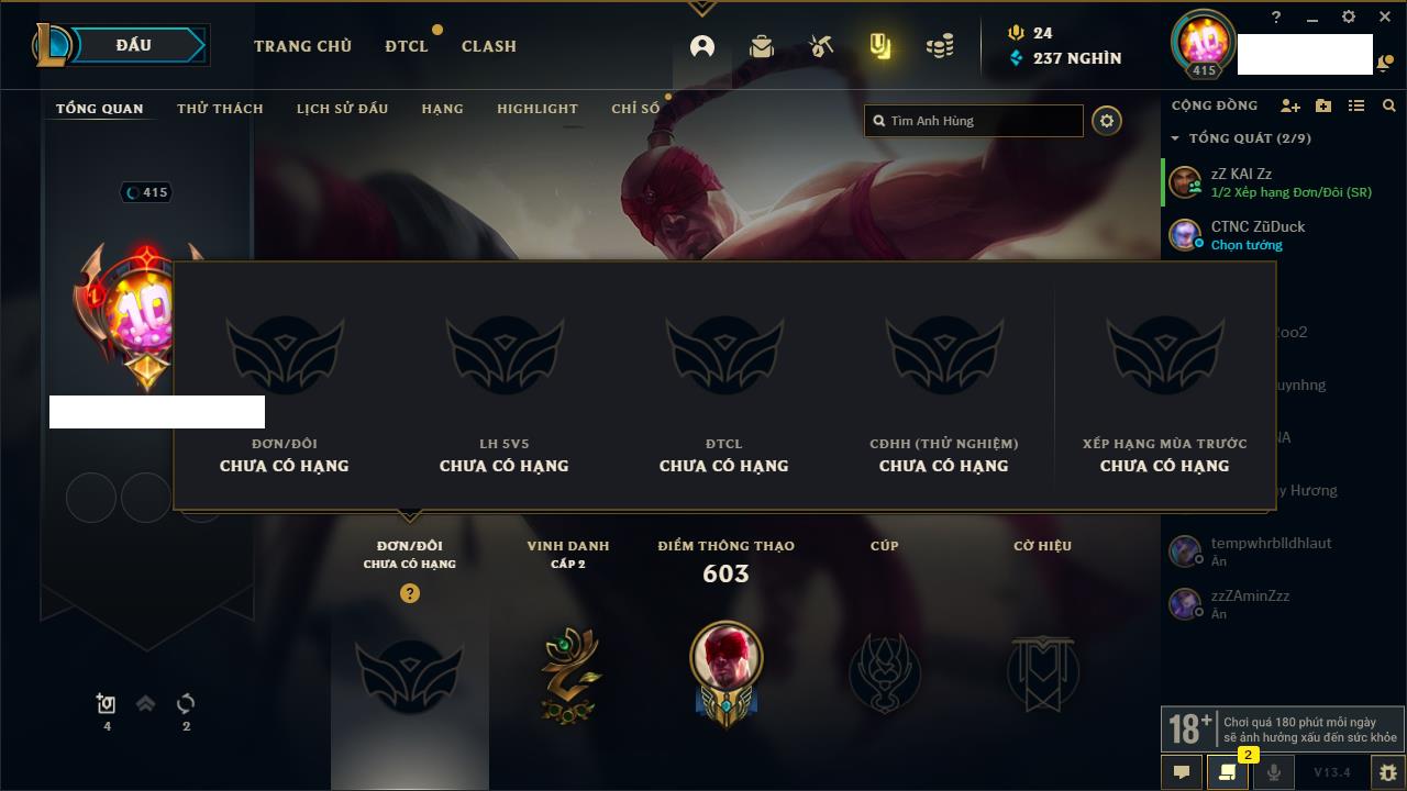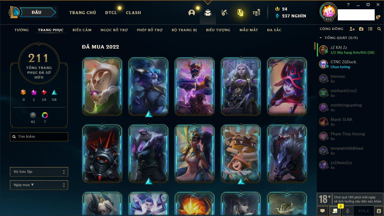 Rank Đơn: Bạc IIIKhung: BạcTướng: 171 - Còn 51045 THXTrang Phục: 220Rank ĐTCL: Sắt IILinh Thú: 141