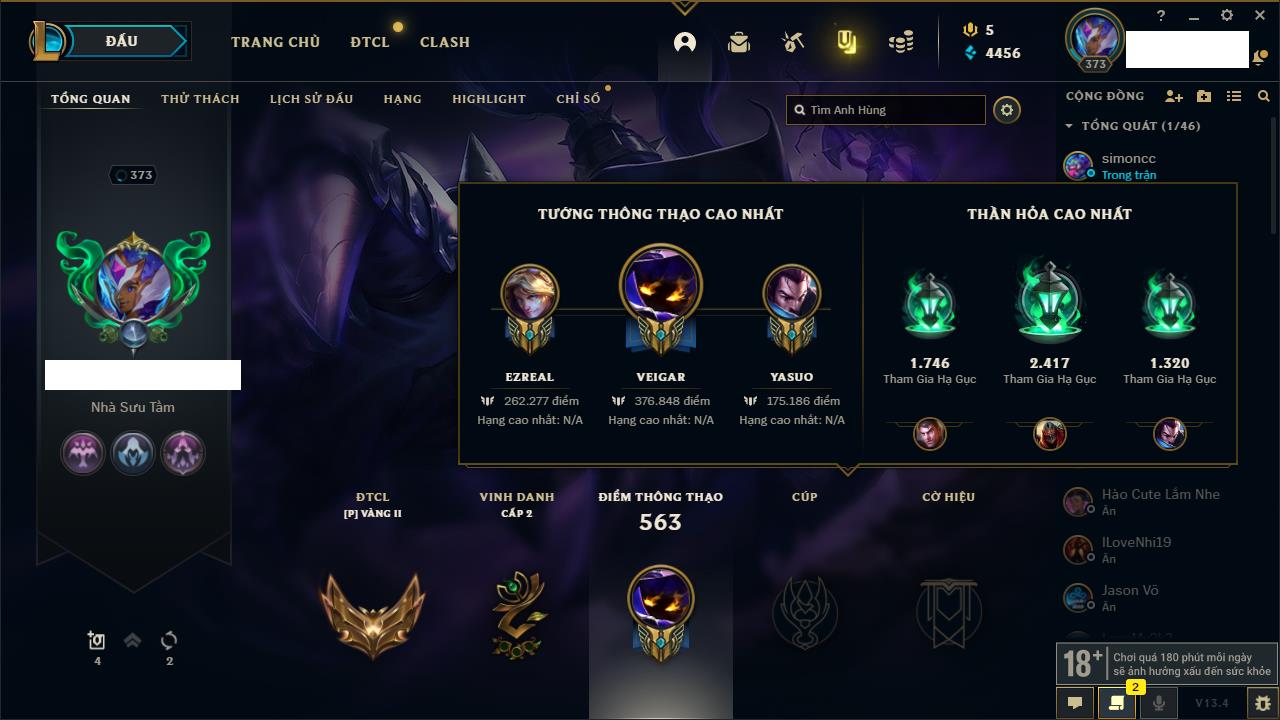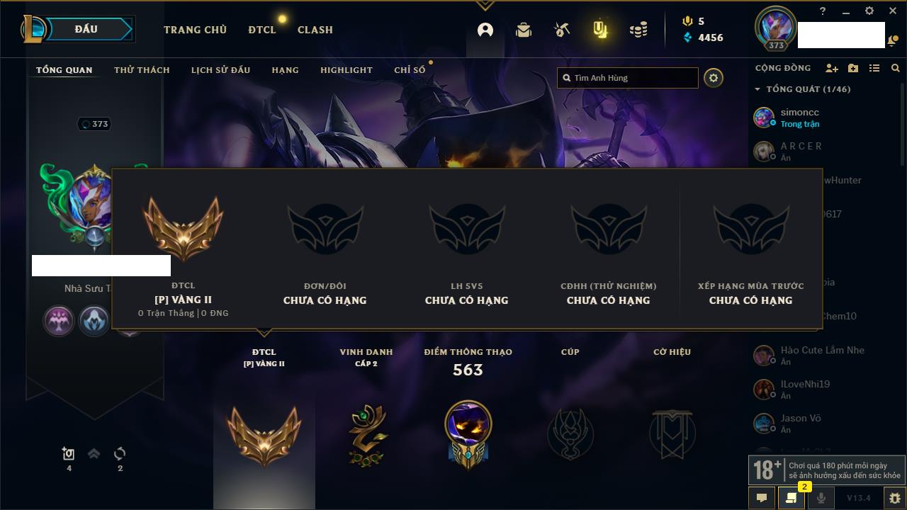 Rank Đơn: Vàng IVKhung: BạcTướng: 171 - Còn 231097 THXTrang Phục: 180Rank ĐTCL: Vàng IVLinh Thú: 110