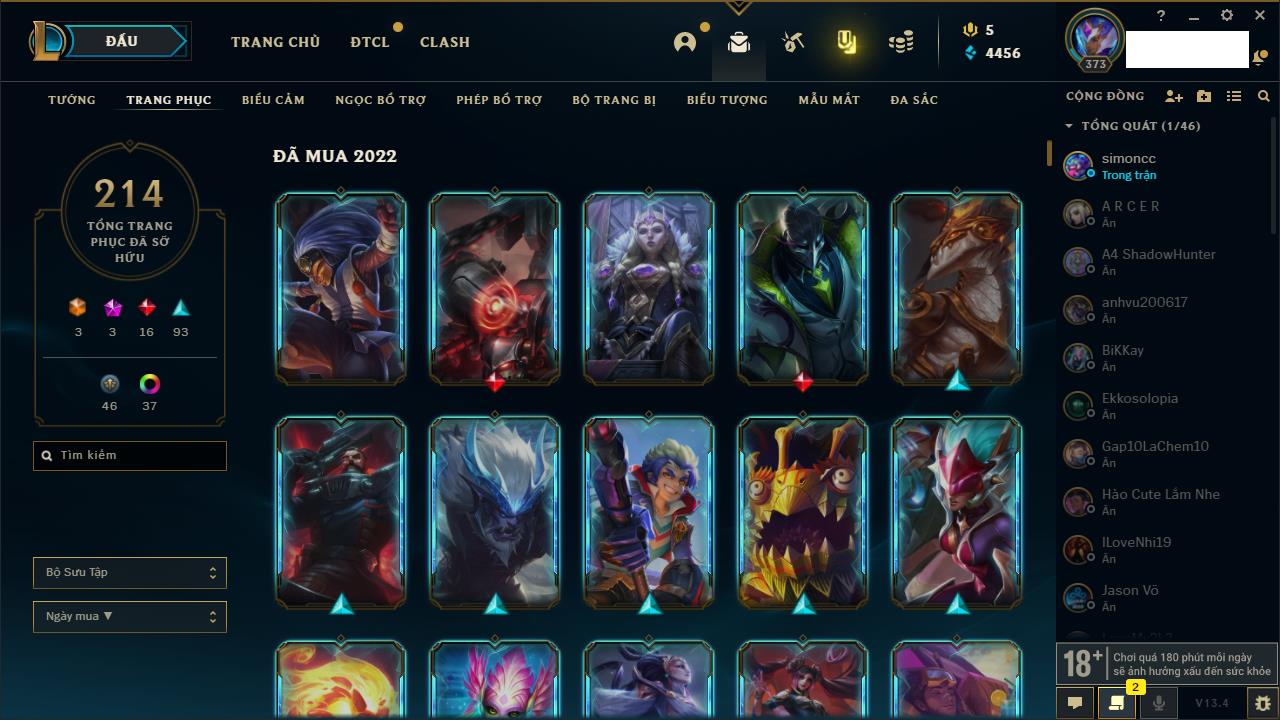 Rank Đơn: Vàng IVKhung: VàngTướng: 171 - Còn 48721 THXTrang Phục: 171Rank ĐTCL: Chưa RankLinh Thú: 27
