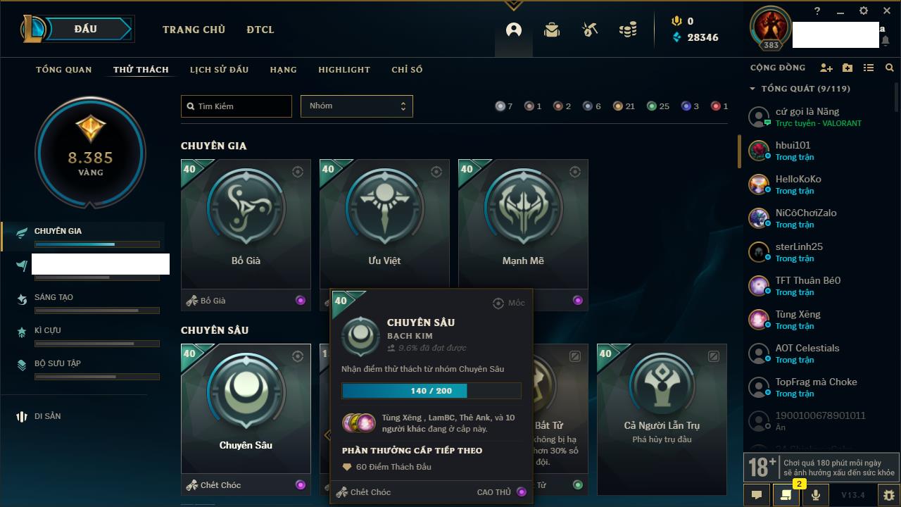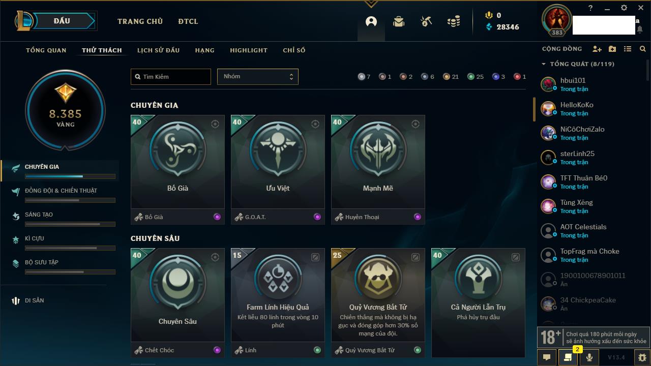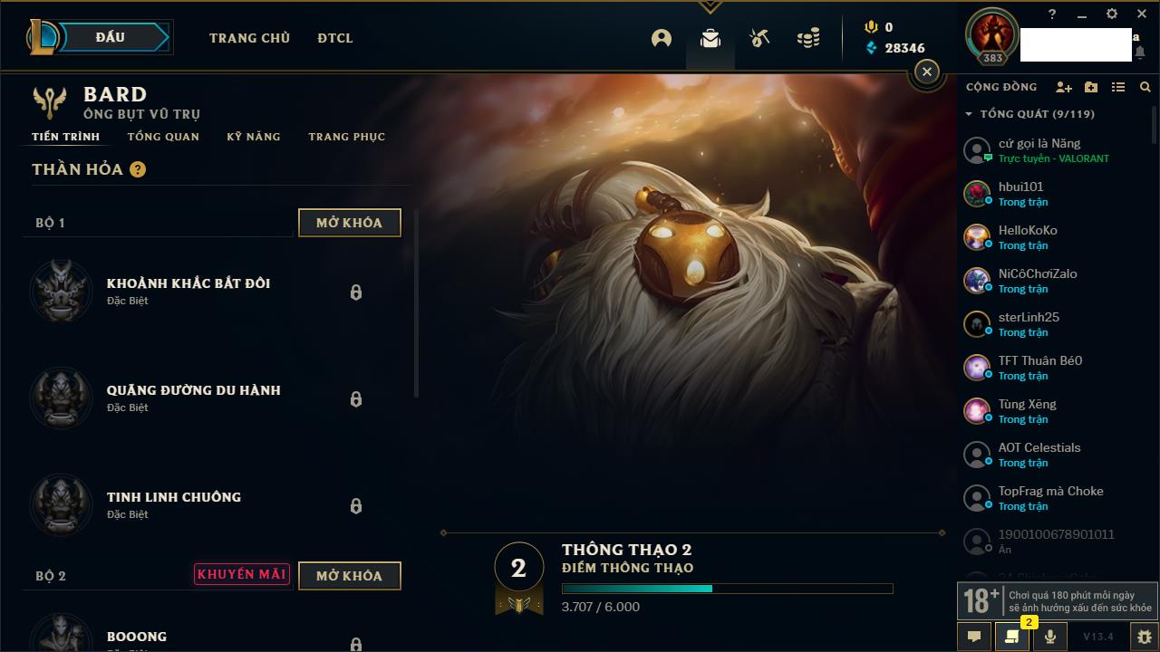 Rank Đơn: Bạc IIKhung: VàngTướng: 171 - Còn 332462 THXTrang Phục: 165Rank ĐTCL: Kim Cương IVLinh Thú: 181