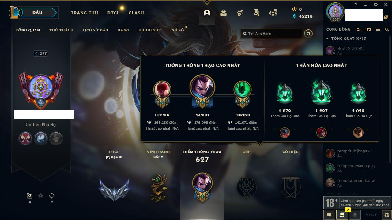 Rank Đơn: Vàng IVKhung: BạcTướng: 166 - Còn 180925 THXTrang Phục: 163Rank ĐTCL: Chưa RankLinh Thú: 67