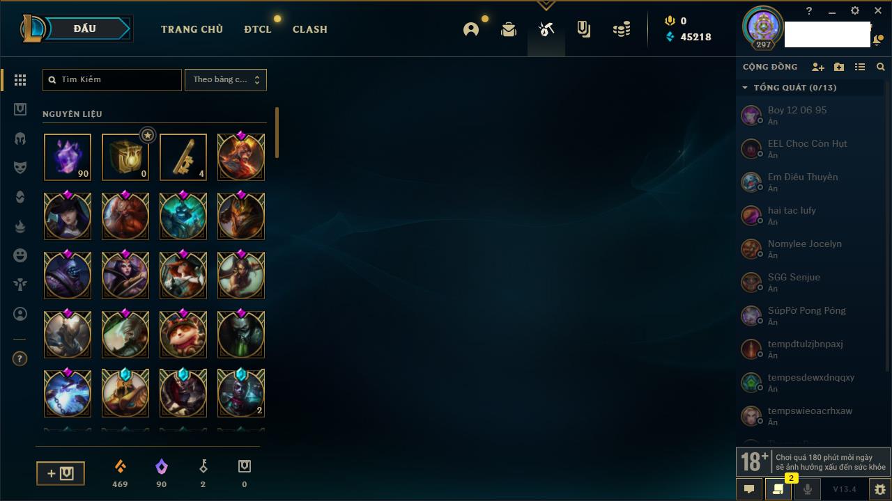 Rank Đơn: Vàng IVKhung: VàngTướng: 171 - Còn 48721 THXTrang Phục: 171Rank ĐTCL: Chưa RankLinh Thú: 27
