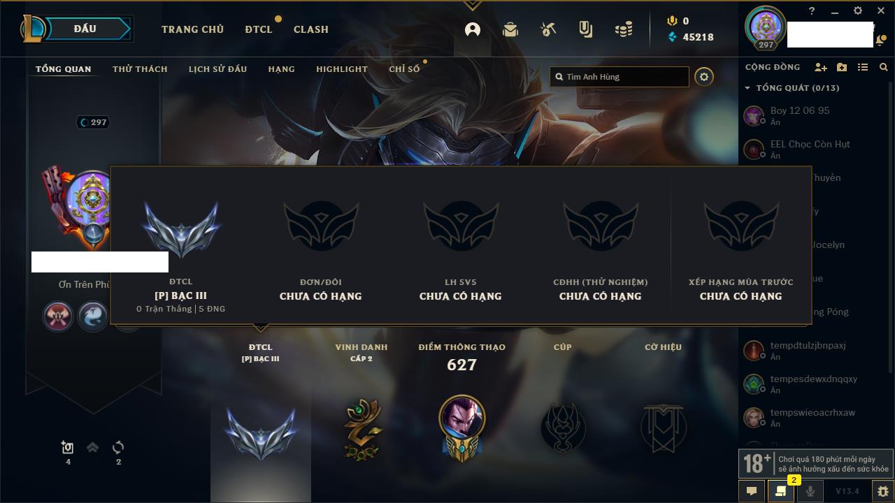Rank Đơn: Bạc IIKhung: VàngTướng: 171 - Còn 332462 THXTrang Phục: 165Rank ĐTCL: Kim Cương IVLinh Thú: 181