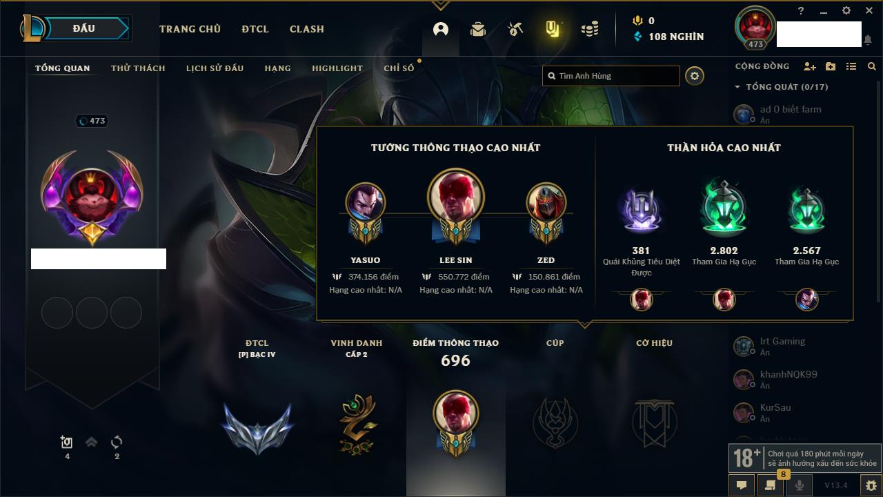 Rank Đơn: Chưa rank mùa nàoKhung: Chưa có khungTướng: 150 - Còn 4492 THXTrang Phục: 7Rank ĐTCL: Chưa RankLinh Thú: 14