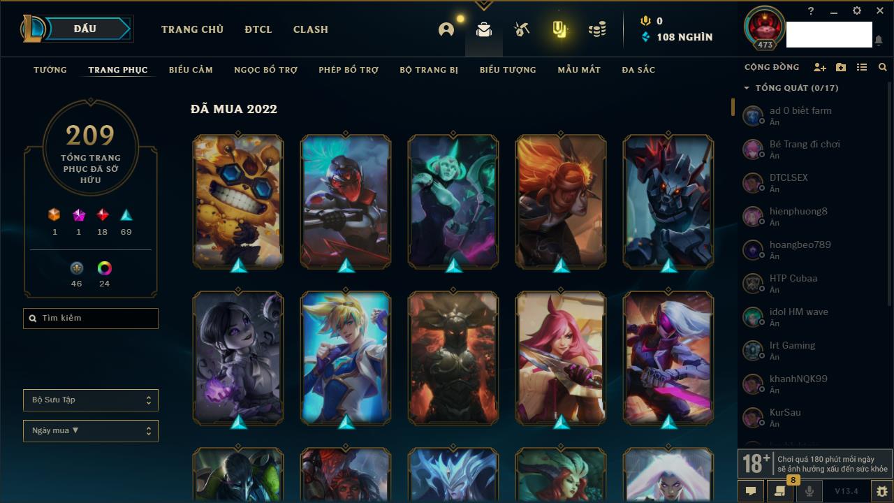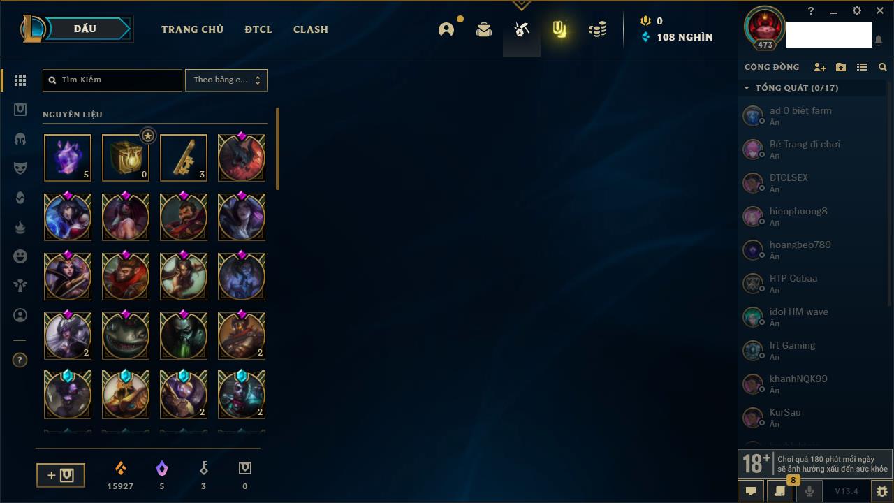 Rank Đơn: Chưa RankKhung: Chưa có khungTướng: 162 - Còn 177300 THXTrang Phục: 102Rank ĐTCL: Chưa RankLinh Thú: 9