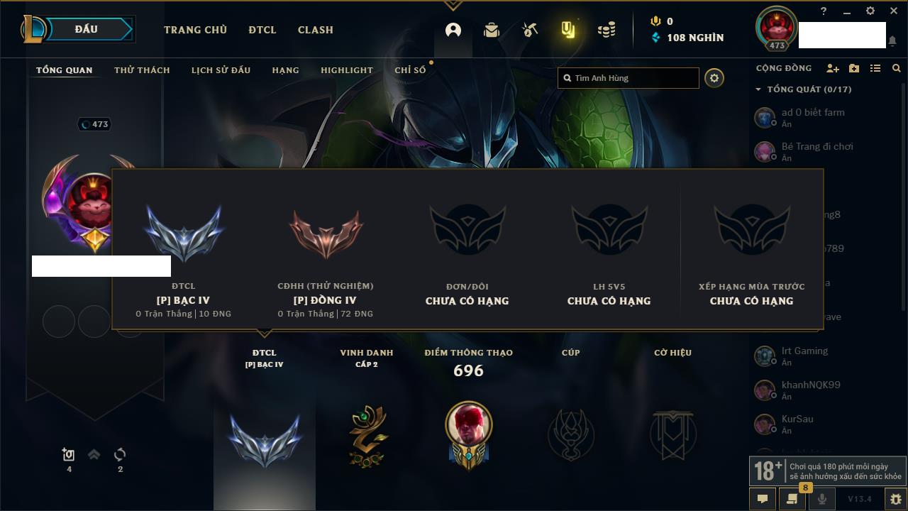 Rank Đơn: Chưa rank mùa nàoKhung: Chưa có khungTướng: 0 - Còn 15550 THXTrang Phục: 0Rank ĐTCL: Chưa rank mùa nàoLinh Thú: 18