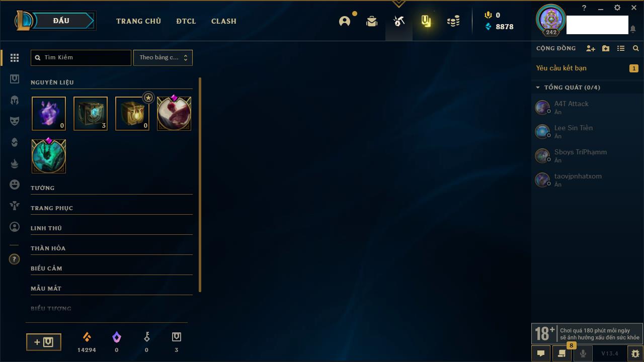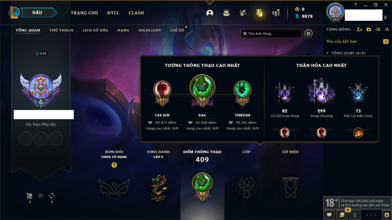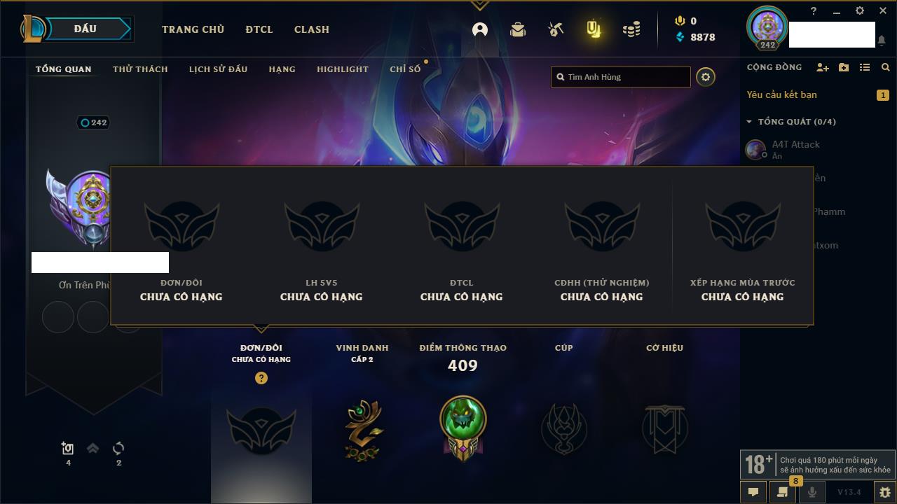 Rank Đơn: Chưa rank mùa nàoKhung: Chưa có khungTướng: 0 - Còn 15550 THXTrang Phục: 0Rank ĐTCL: Chưa rank mùa nàoLinh Thú: 18