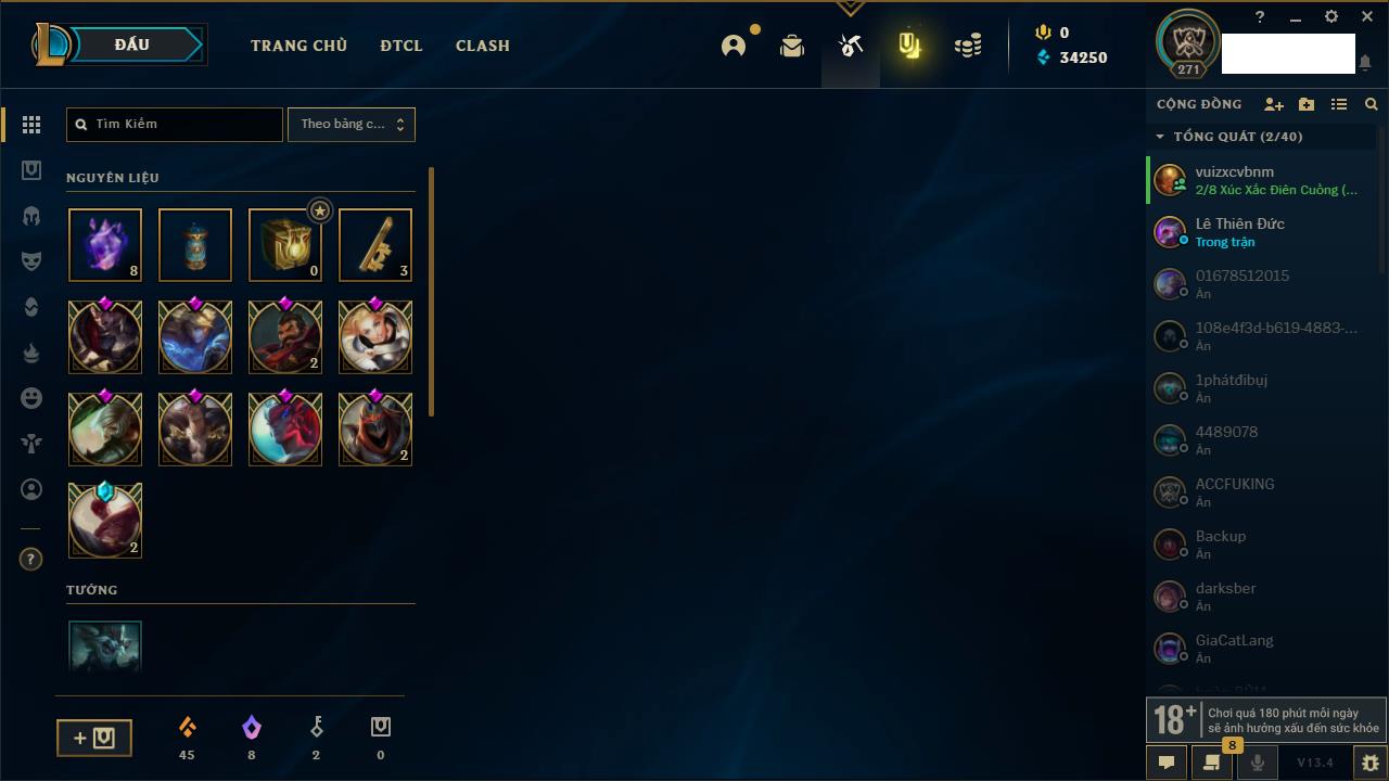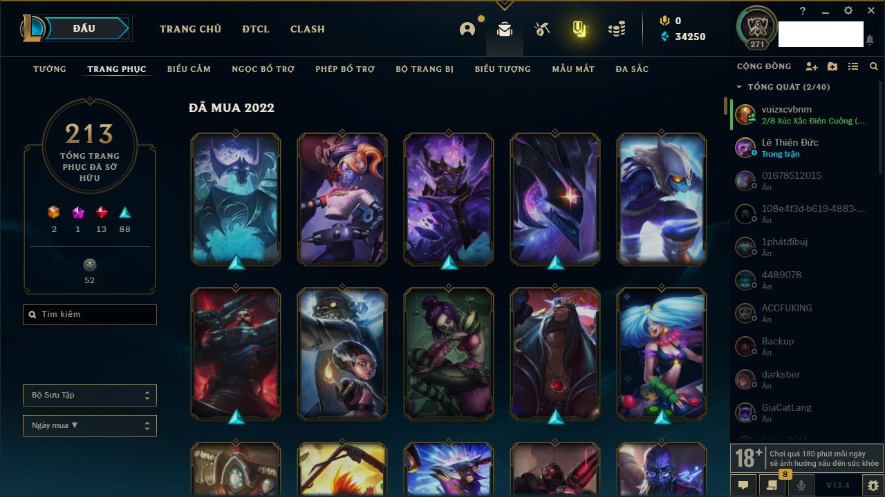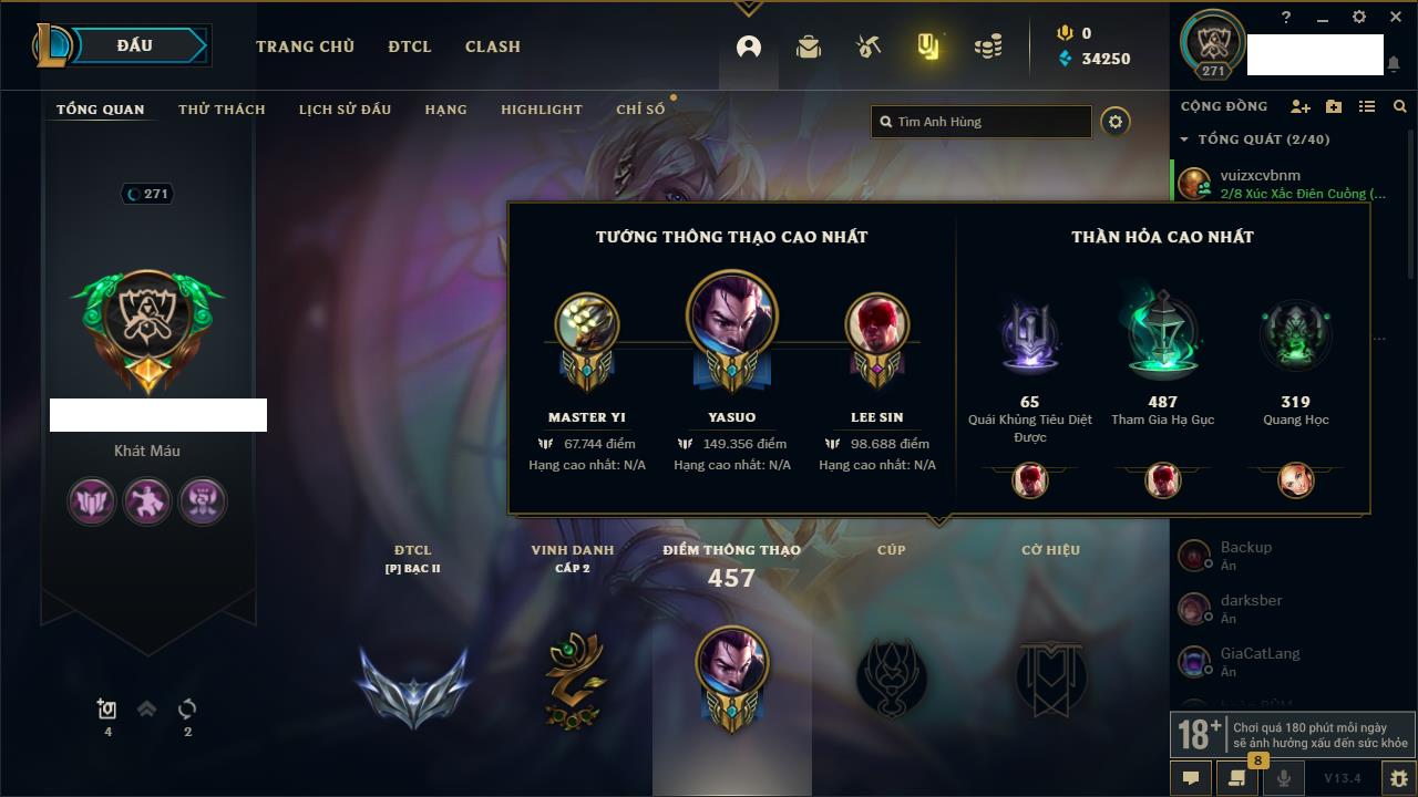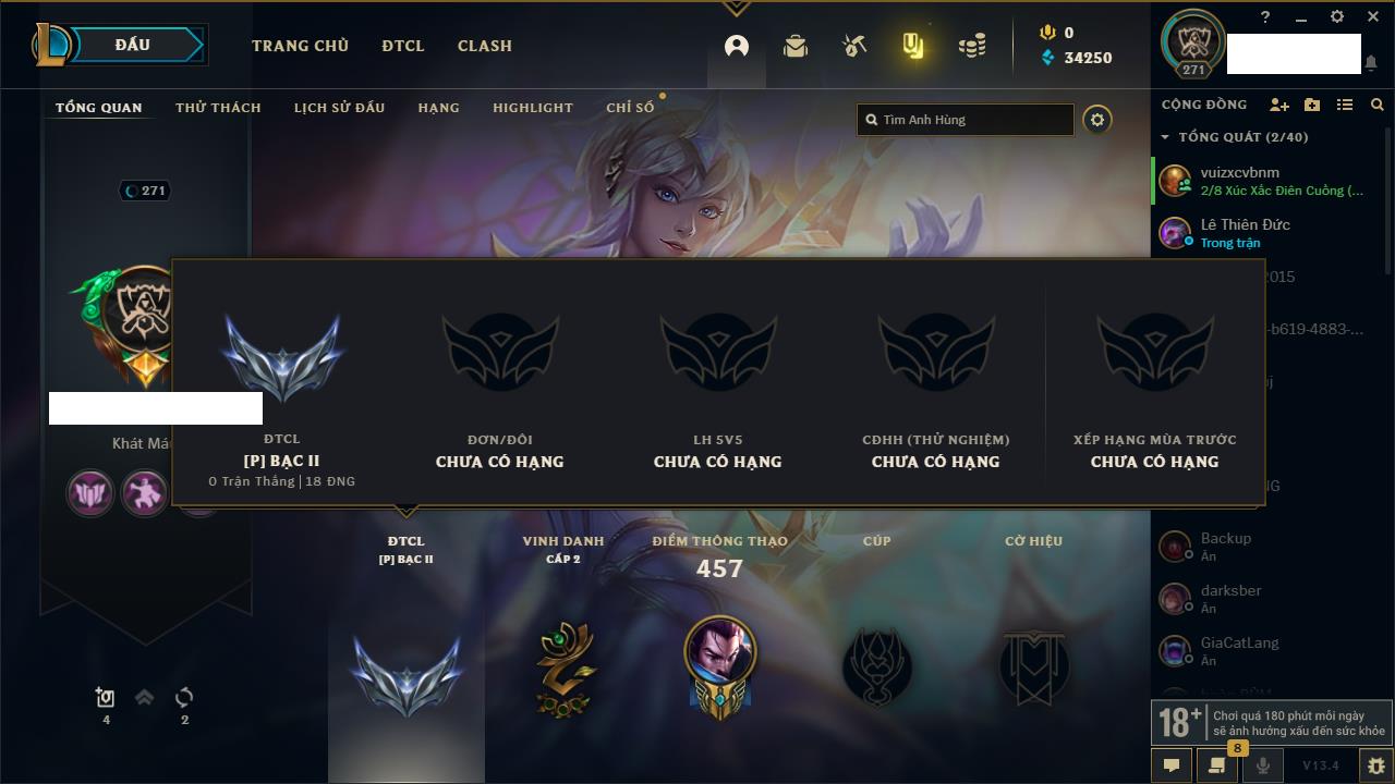 Rank Đơn: Bạc IIIKhung: VàngTướng: 171 - Còn 386278 THXTrang Phục: 170Rank ĐTCL: Chưa RankLinh Thú: 30