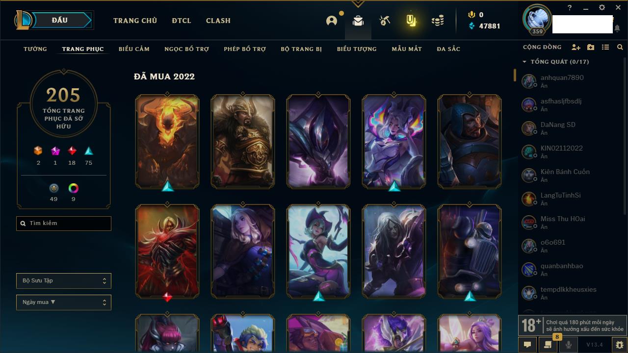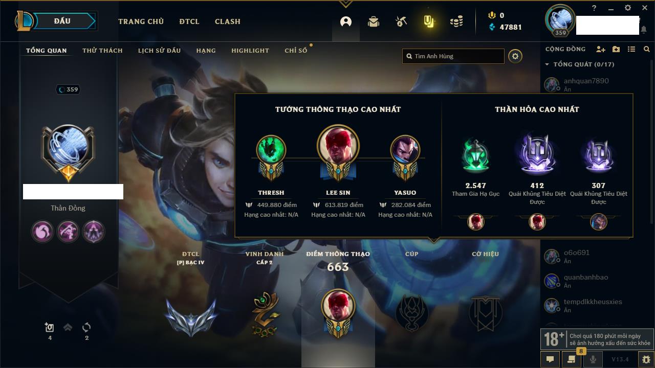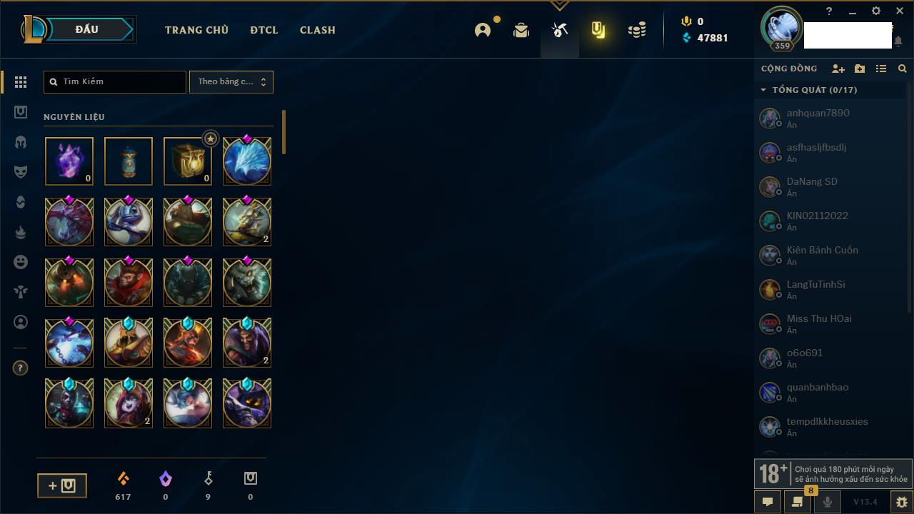 Rank Đơn: Bạc IIIKhung: VàngTướng: 171 - Còn 386278 THXTrang Phục: 170Rank ĐTCL: Chưa RankLinh Thú: 30