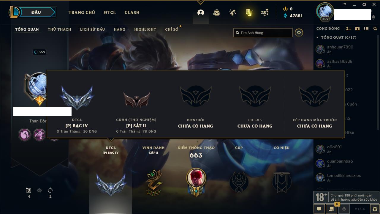 Rank Đơn: Bạc IVKhung: BạcTướng: 171 - Còn 102637 THXTrang Phục: 169Rank ĐTCL: Vàng IILinh Thú: 127