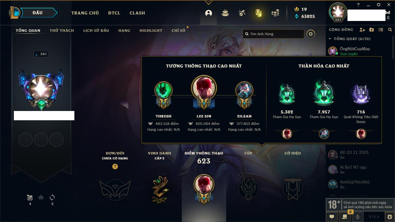 Rank Đơn: Vàng IVKhung: BạcTướng: 166 - Còn 180925 THXTrang Phục: 163Rank ĐTCL: Chưa RankLinh Thú: 67