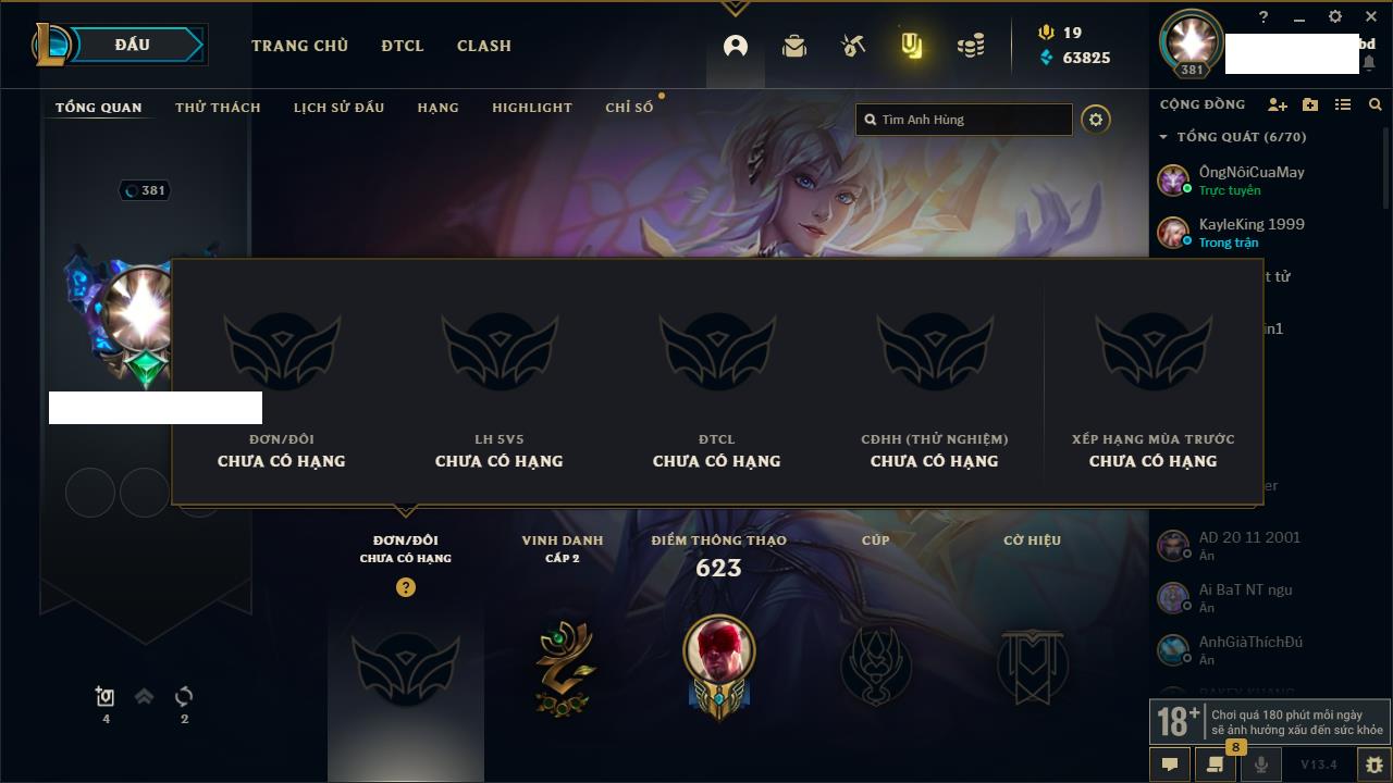 Rank Đơn: Bạc IIKhung: VàngTướng: 171 - Còn 332462 THXTrang Phục: 165Rank ĐTCL: Kim Cương IVLinh Thú: 181