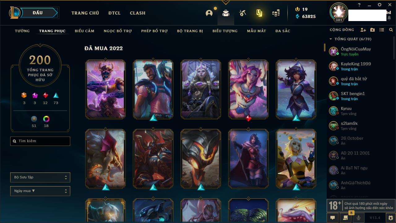 Rank Đơn: Vàng IVKhung: VàngTướng: 171 - Còn 48721 THXTrang Phục: 171Rank ĐTCL: Chưa RankLinh Thú: 27